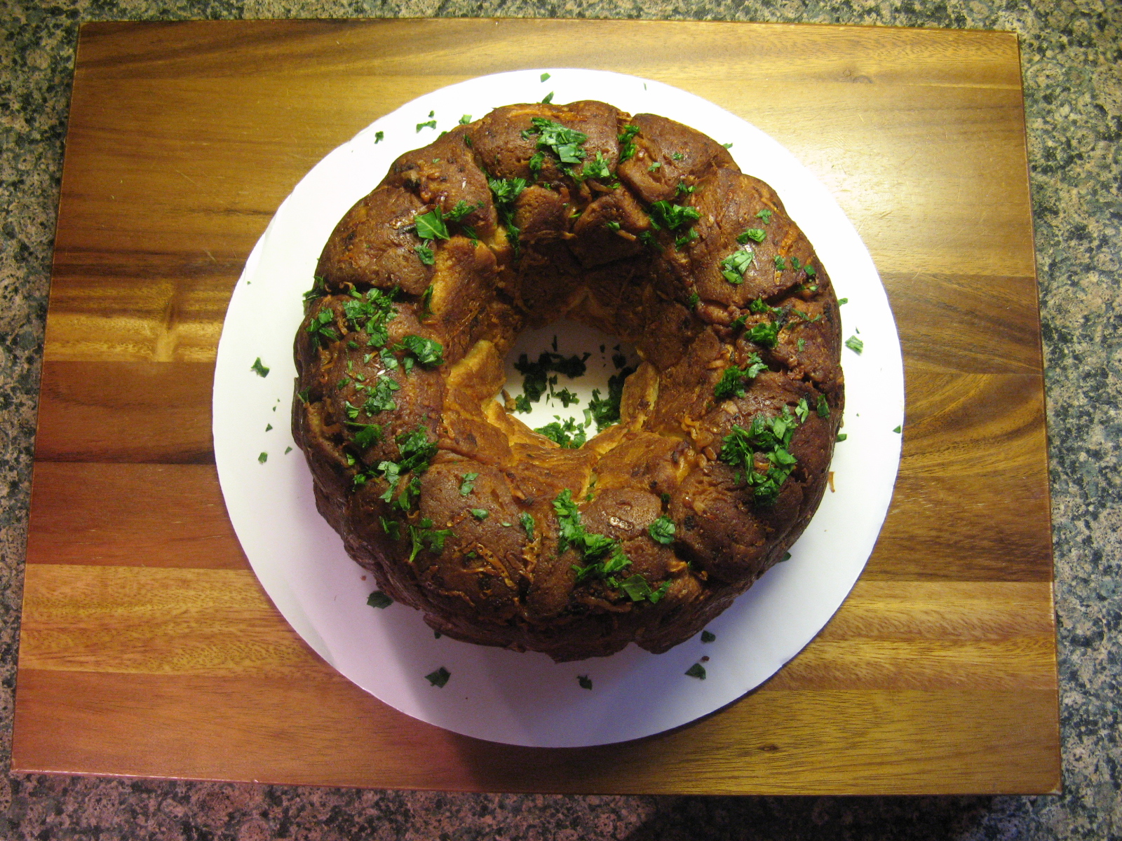 I then baked it in a 350F preheated oven for about 35 to 40 minutes. Until it was browned on top and I was sure that all of the biscuit pieces had cooked throughout the monkey bread. After letting it cool in the pan for a few minutes I inverted it and sprinkled it with freshly chopped parsley…