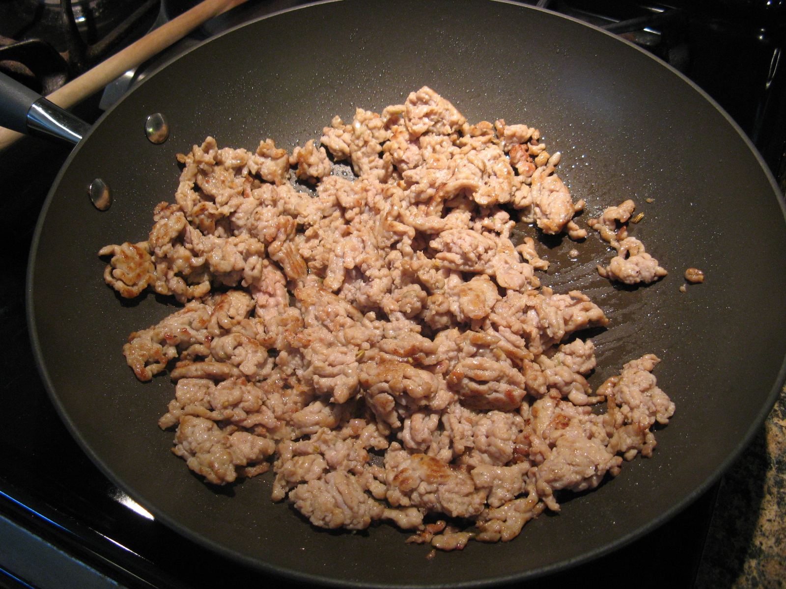 I began by browning a pound of sausage meat in a 12-inch skillet. I was able to find ground sausage meat, but, you could easily use a pound of sausage removed from the casings.