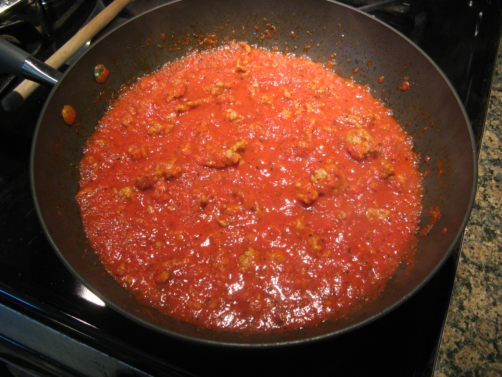 I then returned the skillet to heat; covered and cooked over medium heat until the noodles were softened and sauce began to bubble, about 15-20 minutes. I think next time I will do this step over medium-low heat. I then topped it with remaining cup of spinach and covered and cooked it for another minute or so until the spinach had wilted.