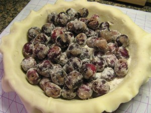 In a Ziploc bag combine the sugar, flour and cinnamon. Add the cherries and toss to coat. Add to the pie crust lined-dish