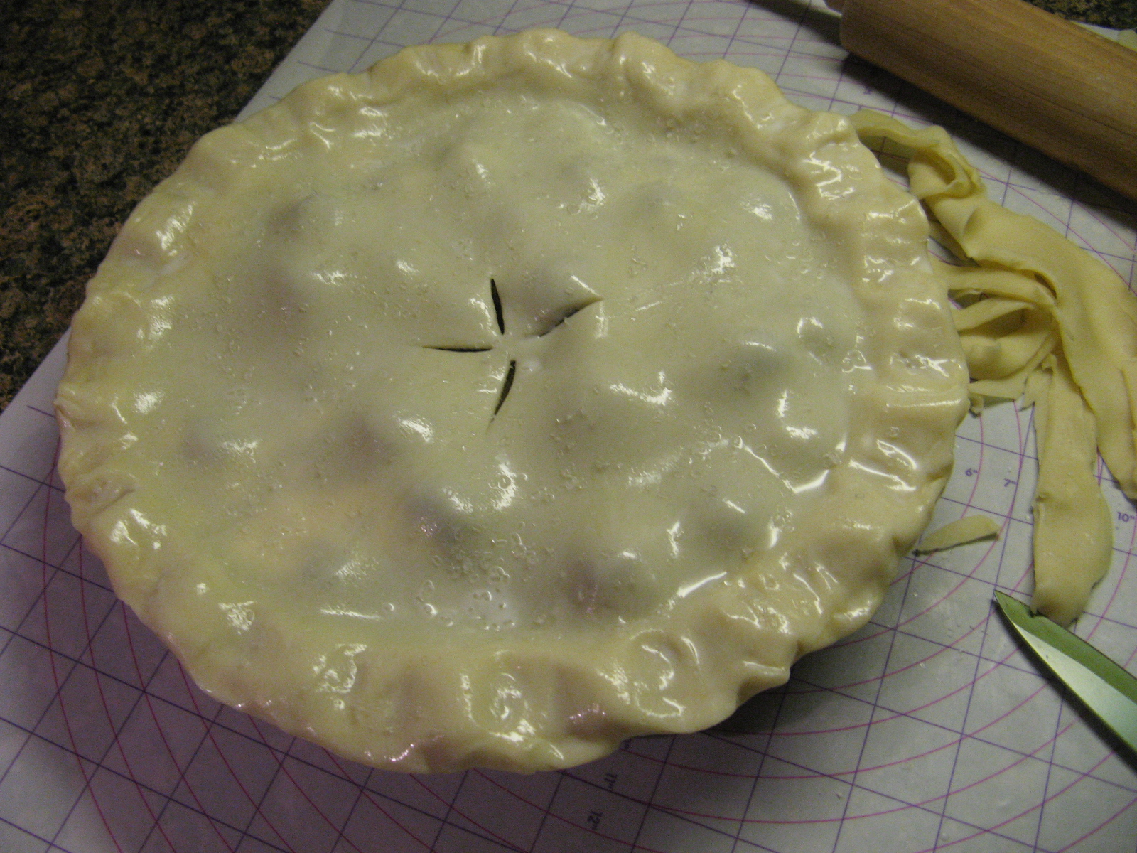 Next, I used the second pie crust to top the pie and brushed it with milk and sprinkled sugar on it.