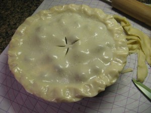 Place the second crust on top and trim the ends. Cut vent slits in the middle of the pie and crimp the edges.