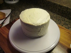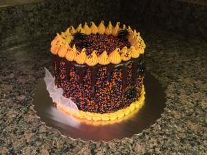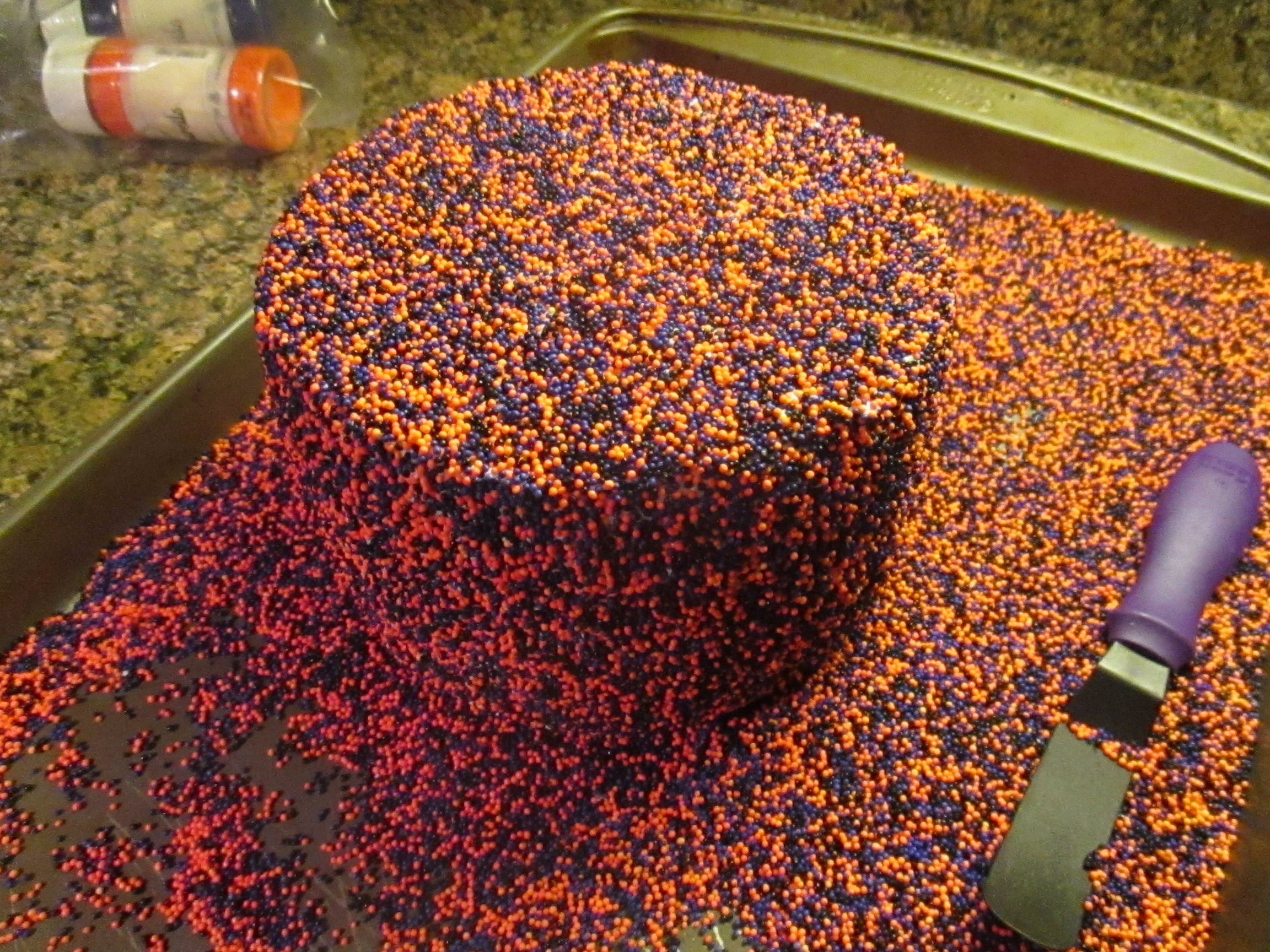 I started off by baking, crumb coating and frosting my cake – getting it as smooth as possible. I opted to use a box cake mix – Pillsbury’s Halloween Funfetti Cake Mix – and store bought vanilla frosting – Betty Crocker Vanilla Frosting. Since I wasn’t all that sure how many ounces of sprinkles I was going to need – I had a rough idea -and because I was planning on rolling the cake in a bed of sprinkles I opted to keep it small – 6 inches.