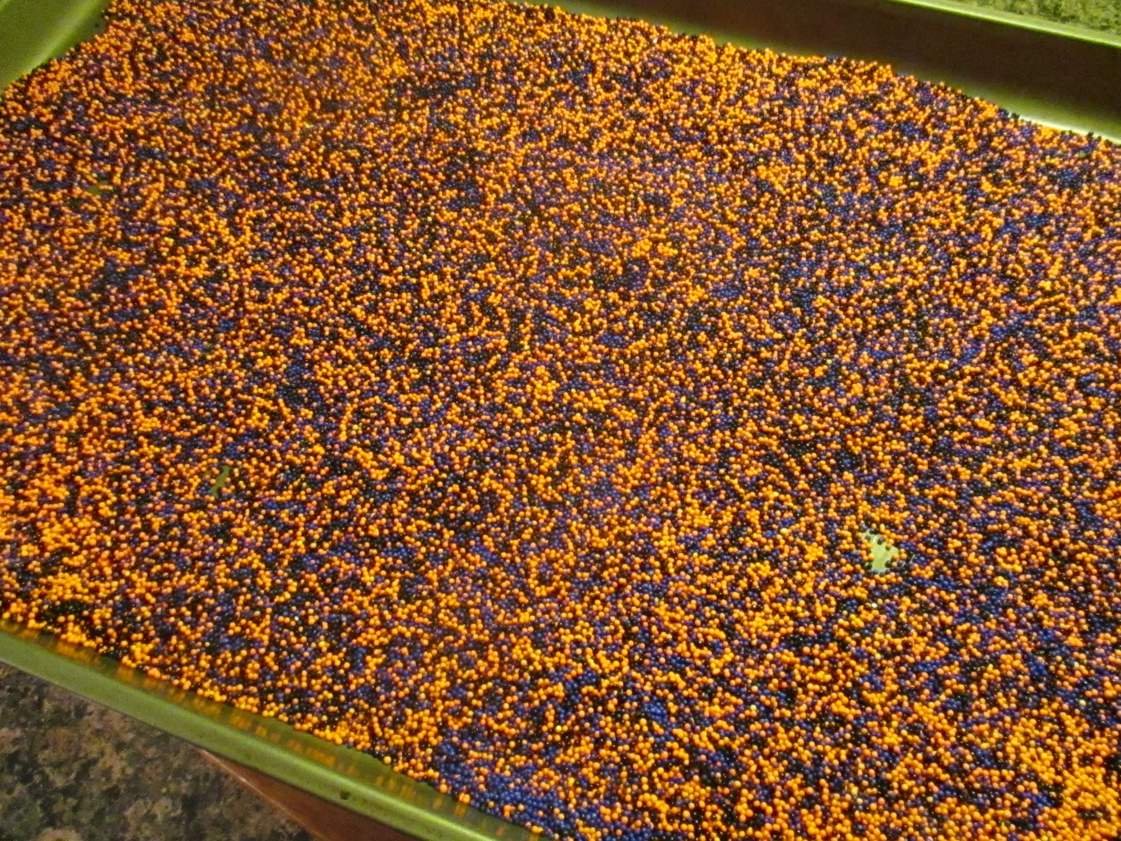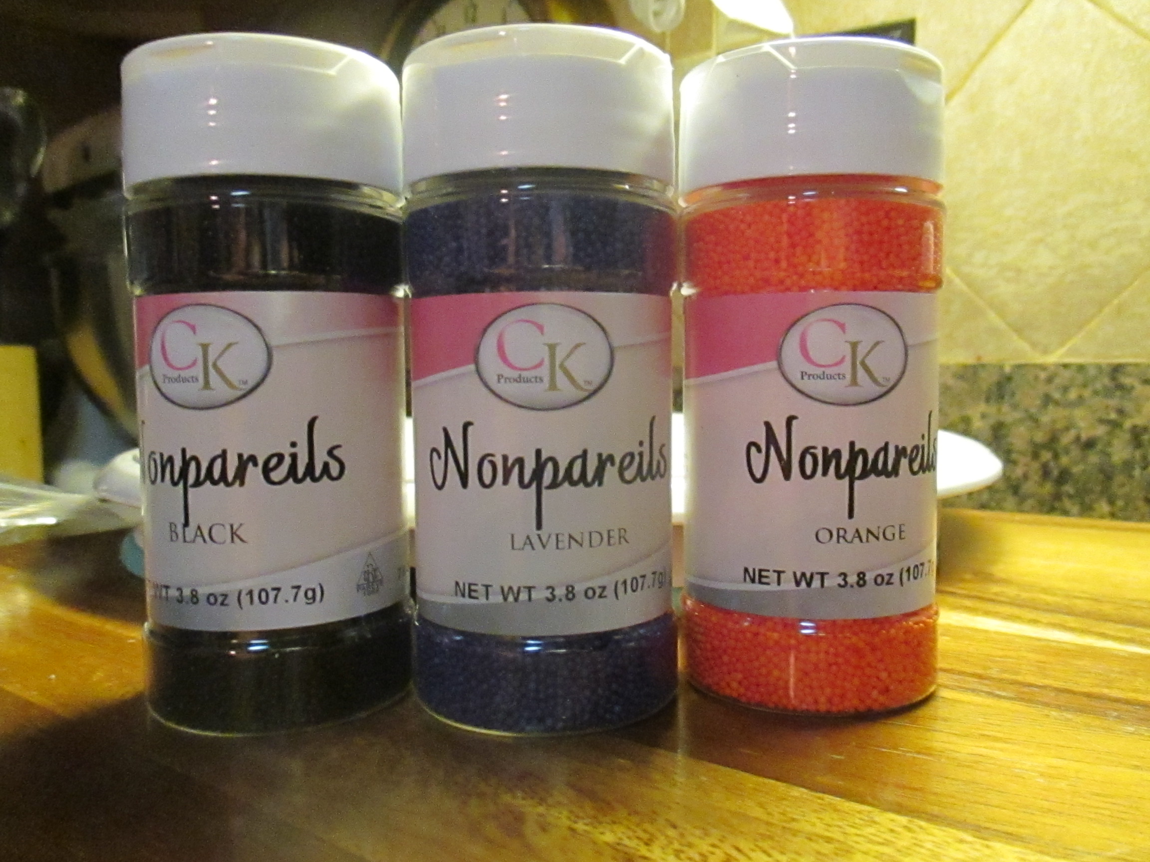 Speaking of the sprinkles… I order nonpareils – basically tiny balls of sprinkles – in purple, orange and black from NY Cake. I did a little research and they had the colors I wanted at the best price. I also ordered the green cupcake liners I used for the Cupcake Bouquet I made back in May from them. I went to their shop once in NYC and at the time I was just wandering around aimlessly looking at things. Since I decorate cakes more often now I am sure I would make the most of my next visit.