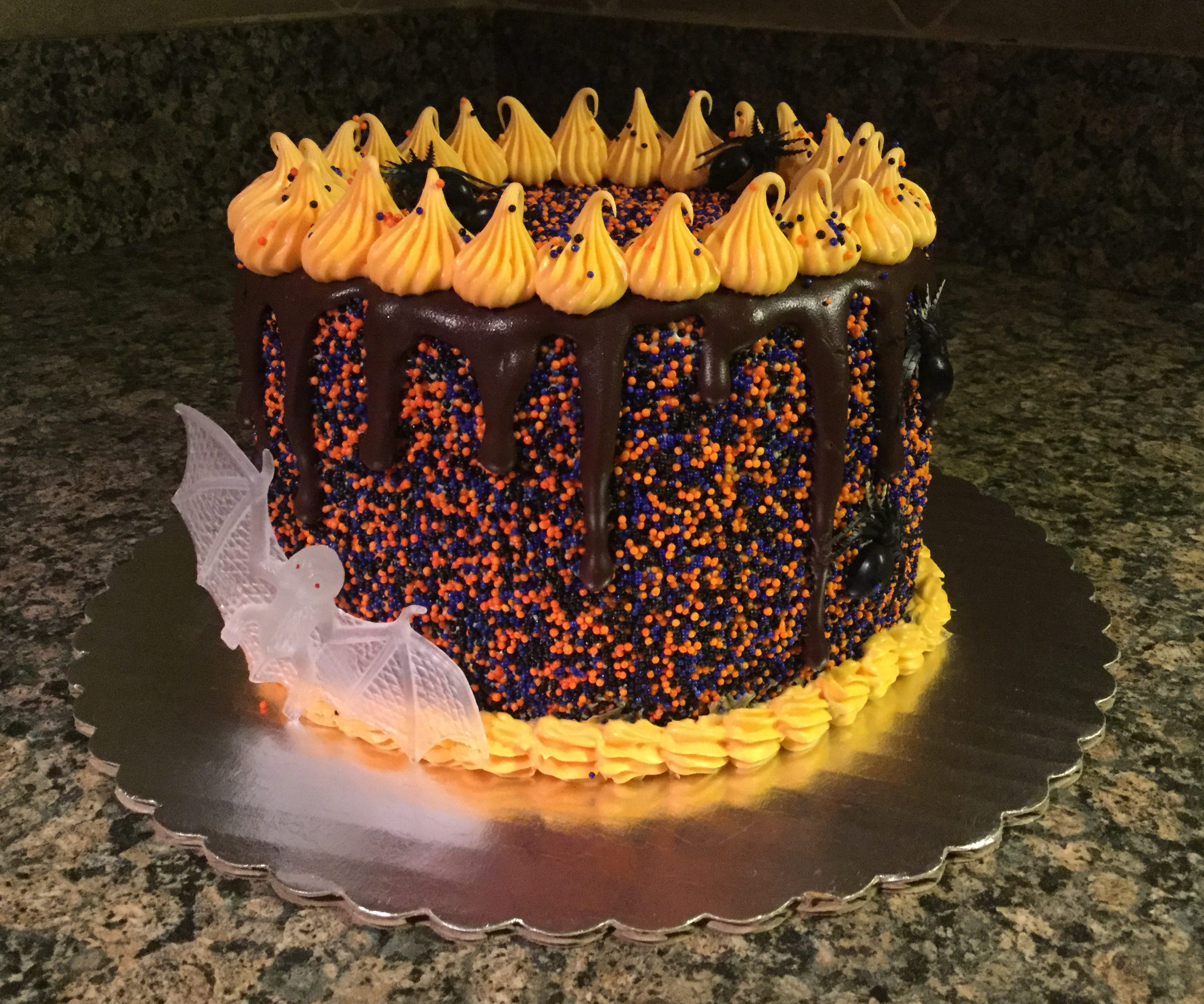 After that, I tinted some of the remaining vanilla frosting a light orange color and piped a border around the bottom of the cake and used a large star tip to decorate the top. And finally placed a bat and a few creepy crawlers – spiders – on the cake for a final touch.