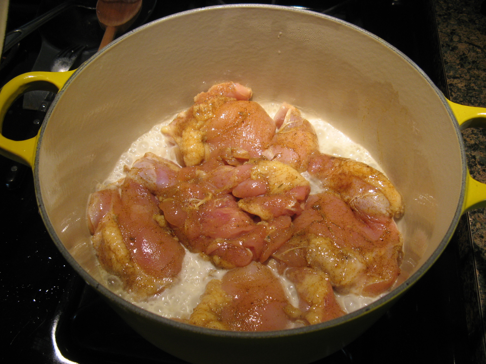 To start I browned boneless skinless chicken thighs that I seasoned with curry powder, allspice, thyme salt and pepper in melted coconut cream that I skimmed off the stop of the coconut milk. Just remember not to shake the coconut milk or you won’t be able to skim this cream off of it.