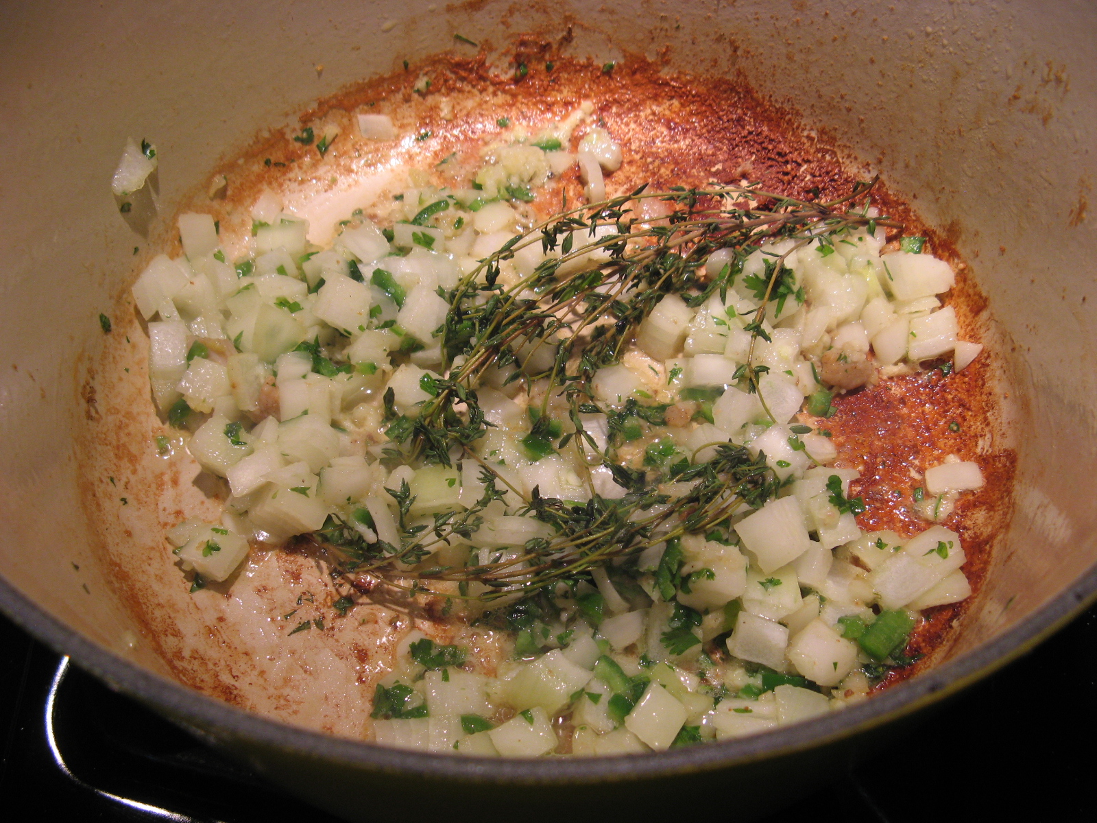 Once the chicken was browned I transferred it to a plate and added onion, garlic, cilantro, a serrano chili and thyme sprigs to my Dutch oven and cooked until the onions began to soften.