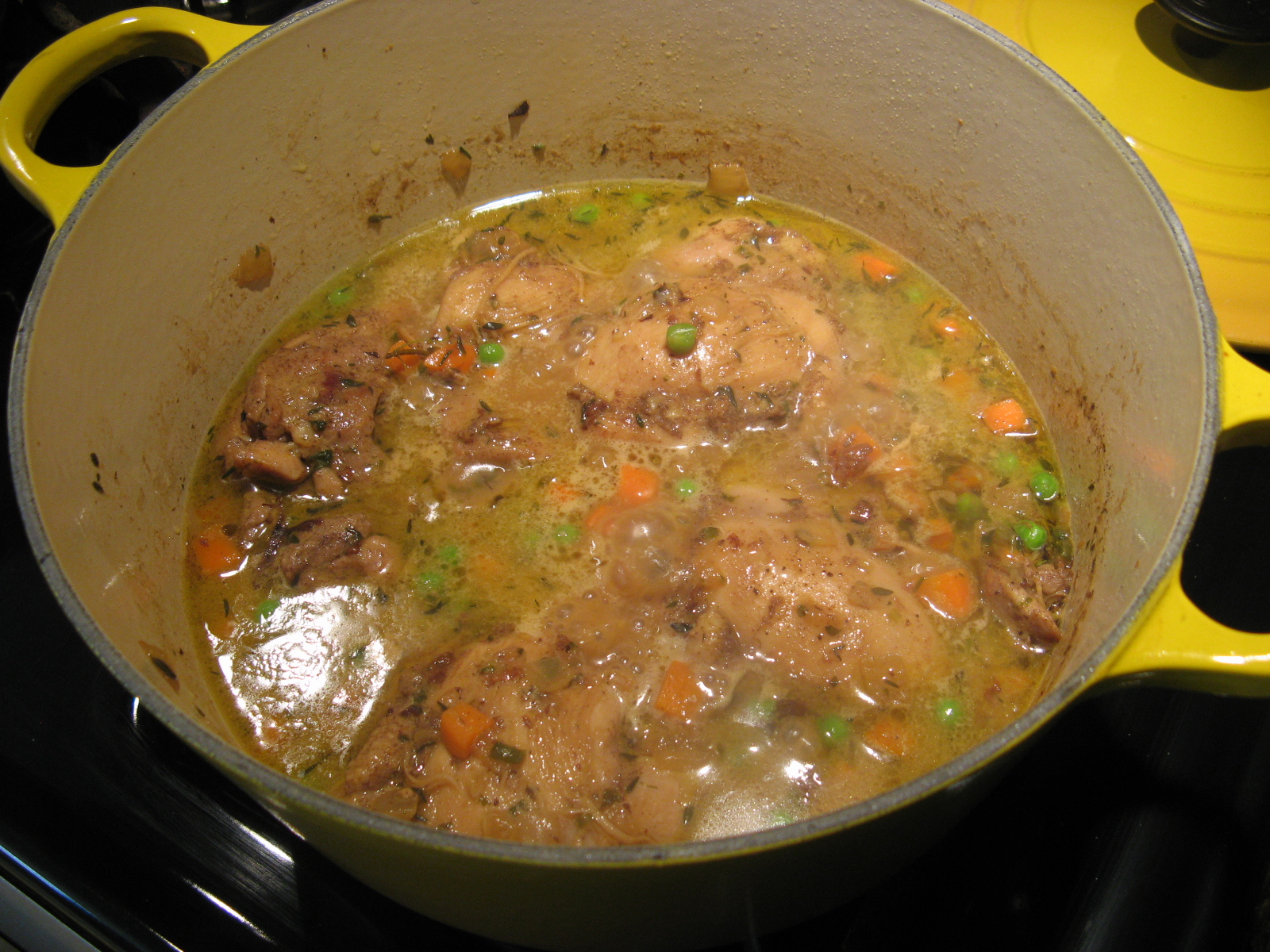 I then returned the chicken to the pot along with water and the remaining coconut cream and milk from the can and cooked it covered on medium-low heat, for about 15 minutes until the sauce was thickened and the chicken was cooked through, about 15-20 minutes. And finally, I added in a cup frozen peas and carrots thawed and cooked everything until the pear and carrots were warmed through. I then seasoned it with salt and pepper.