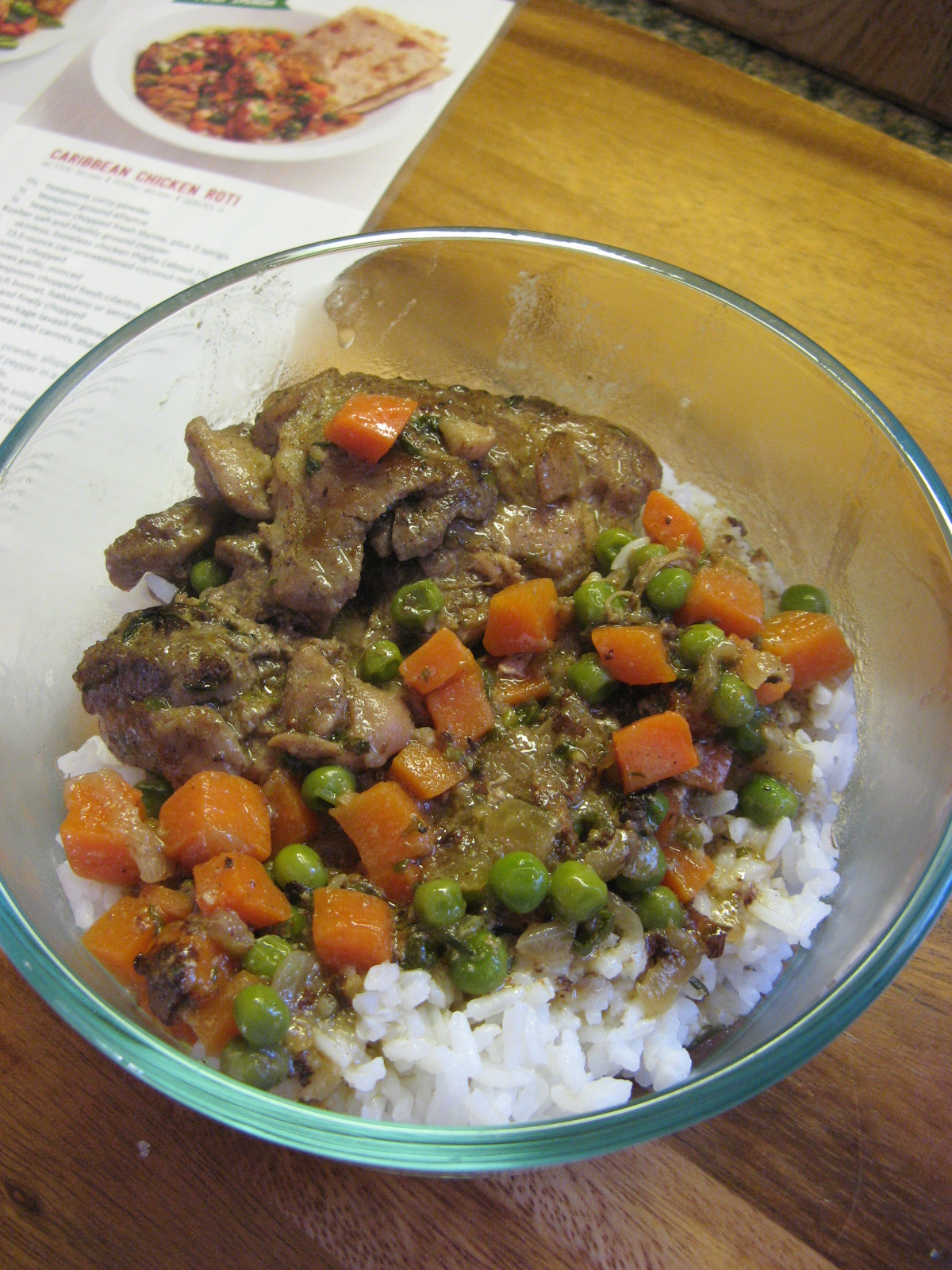 Ingredients: 1 1/2 teaspoons curry powder 1/2 teaspoon ground allspice 1/2 teaspoon chopped fresh thyme, plus 3 sprigs Kosher salt and freshly ground pepper 1 1/2 pounds skinless, boneless chicken thighs, quartered 1 13.5 ounce can unsweetened coconut milk (do not shake) 1 yellow onion, chopped 2 garlic cloves, minced 2 tablespoons chopped fresh cilantro 1 Scotch bonnet, habanero or serrano chili pepper, seeded and finely chopped 1 cup frozen peas and carrots, thawed Cooked white rice for serving Directions: Combine the curry powder, allspice, chopped thyme, 1 teaspoon salt and a few grinds of black pepper in a small bowl and use it to season the chicken. Skim 2 tablespoons of the solid cream off the top of the coconut milk and transfer to a large Dutch oven or pot and melt over medium-high heat. Add the chicken and brown on both sides, about 5-7 minutes. Transfer to a plate. Add the onion, garlic, cilantro, chili and thyme sprigs to the pot and cook, stirring until the onions are softened. Return the chicken to the pot along with a 1/4 cup of water and the coconut milk along with any remaining coconut cream. Reduce the heat to medium, cover and cook until thickened, about 15 minutes. Remove the thyme sprigs and add the peas and carrots and continue cooking until warmed through. Serve with rice. Recipe adapted from Food NetworkCaribbean Chicken