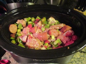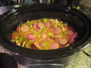 What was even better, this is one of my favorite types of slow cooker recipes – throw it in there and let it cook. I know that doesn’t sound to proper considering we are talking about food, but, I will assume that you know what I mean. In my slow cooker I added in chicken, andouille sausage, okra, green bell pepper, celery, onion, cayenne pepper, salt, can of diced tomatoes, and chicken broth. Now, it may look like there isn’t enough liquid in there….