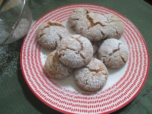 Put the granulated and confectioners’ sugar in separate bowls. Roll tablespoonful of dough into balls and then roll in the granulated sugar and then the confectioners’ sugar. Place on the prepared baking sheets 2 inches apart.