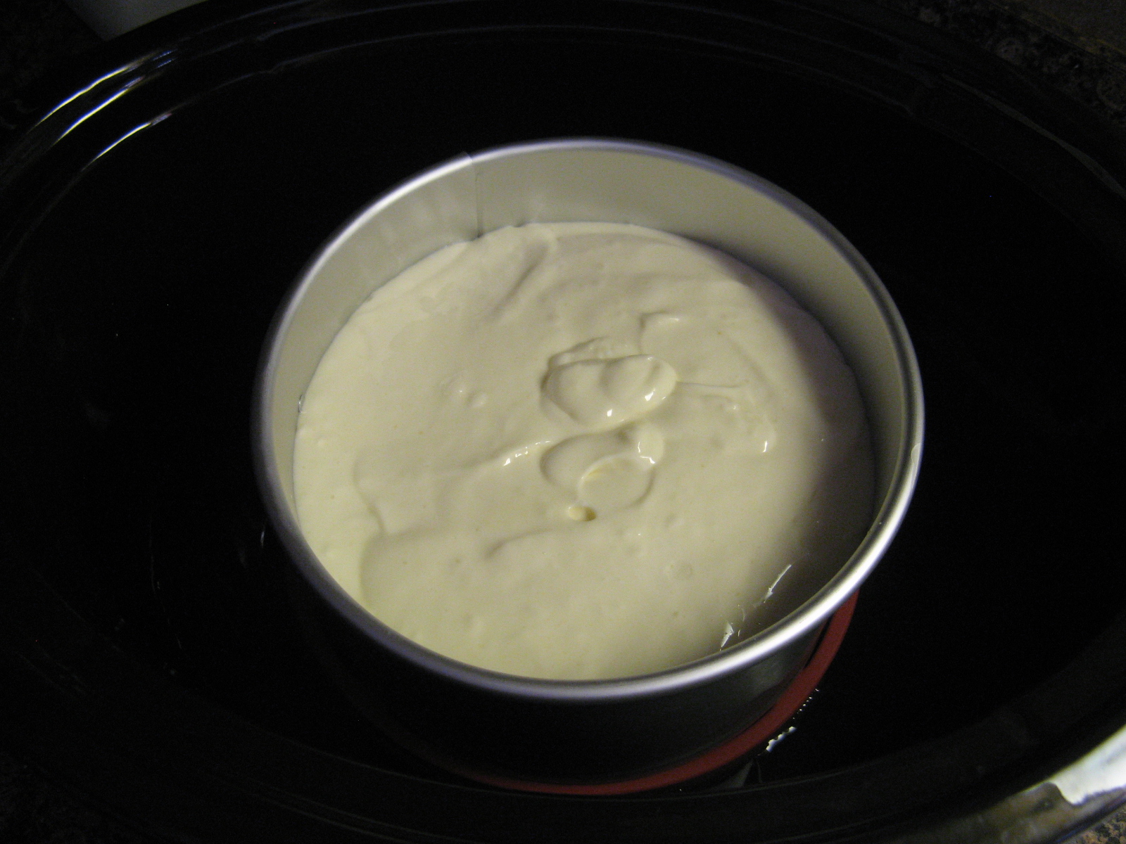 Place a rack inside the insert of your slow cooker and fill with a 1/2 inch of water. Place the pan on top of the rack and cover the slow cooker and cook on high for 2 hours. Turn the slow cooker off and keeping the lid on let the cheesecake cool inside of the slow cooker.