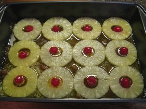 Remove the pan from the oven and sprinkle the brown sugar evenly over the butter. Arrange the pineapple slices over the sugar and then place a cherry in the center of each pineapple slice. Set aside.