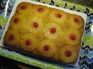 Let the cake cool for a few minutes and then invert on a platter. Let the pan sit on top of the cake for a few additional minutes so all of the syrup can drain out and then remove the pan. If any pineapples or cherries remain on the pain just remove them and place them on the cake.