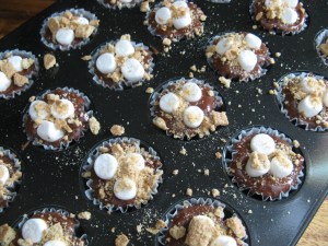 Using a small cookie scoop, fill each paper line with the batter. Press 3 mini marshmallows into the center of the batter and then sprinkle with graham cracker crumbs. Bake in the preheated oven for 10 to 12 minutes, the marshmallows will be puffed and lightly golden. Let cool for 20 minutes and enjoy!