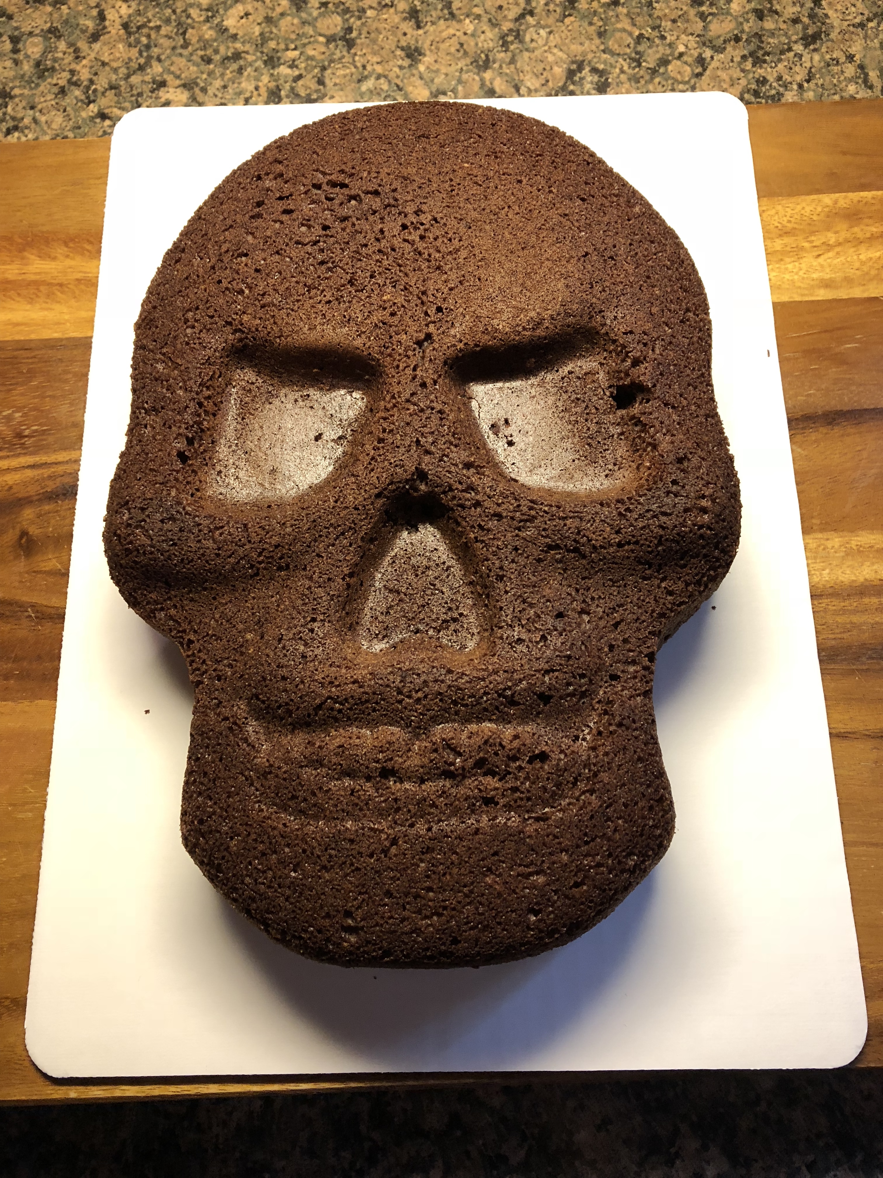 To begin, using the same skeleton pan I used to make my Mummy Cake, I baked a chocolate cake – I used a box cake mix. After letting the cake cool I covered it in plastic wrap and refrigerated it overnight.