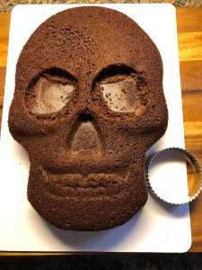 The next day, I made a batch of Brenda’s Bakery Buttercream – also the same frosting I used for the Mummy Cake. After removing the cake from the refrigerator, I used a large circle cookie cutter to cut out larger eyes for the skull. I used the cookie cutter to make an indentation in the cake and then used a butterknife to carve out the eyes.