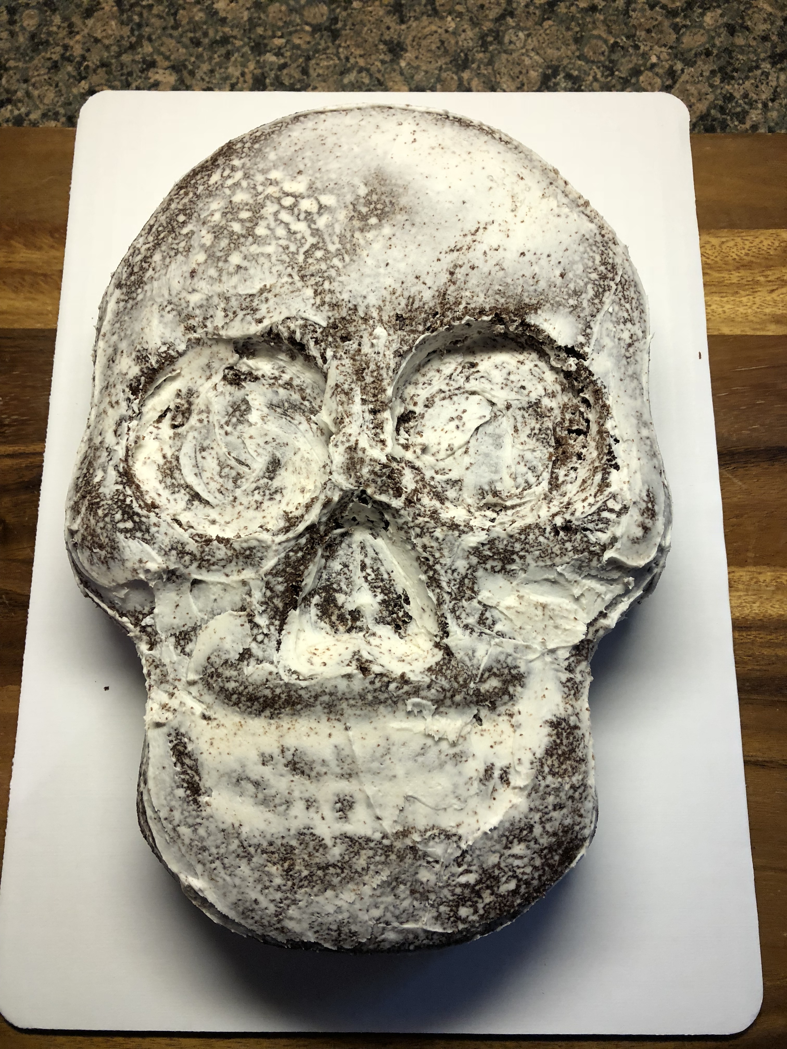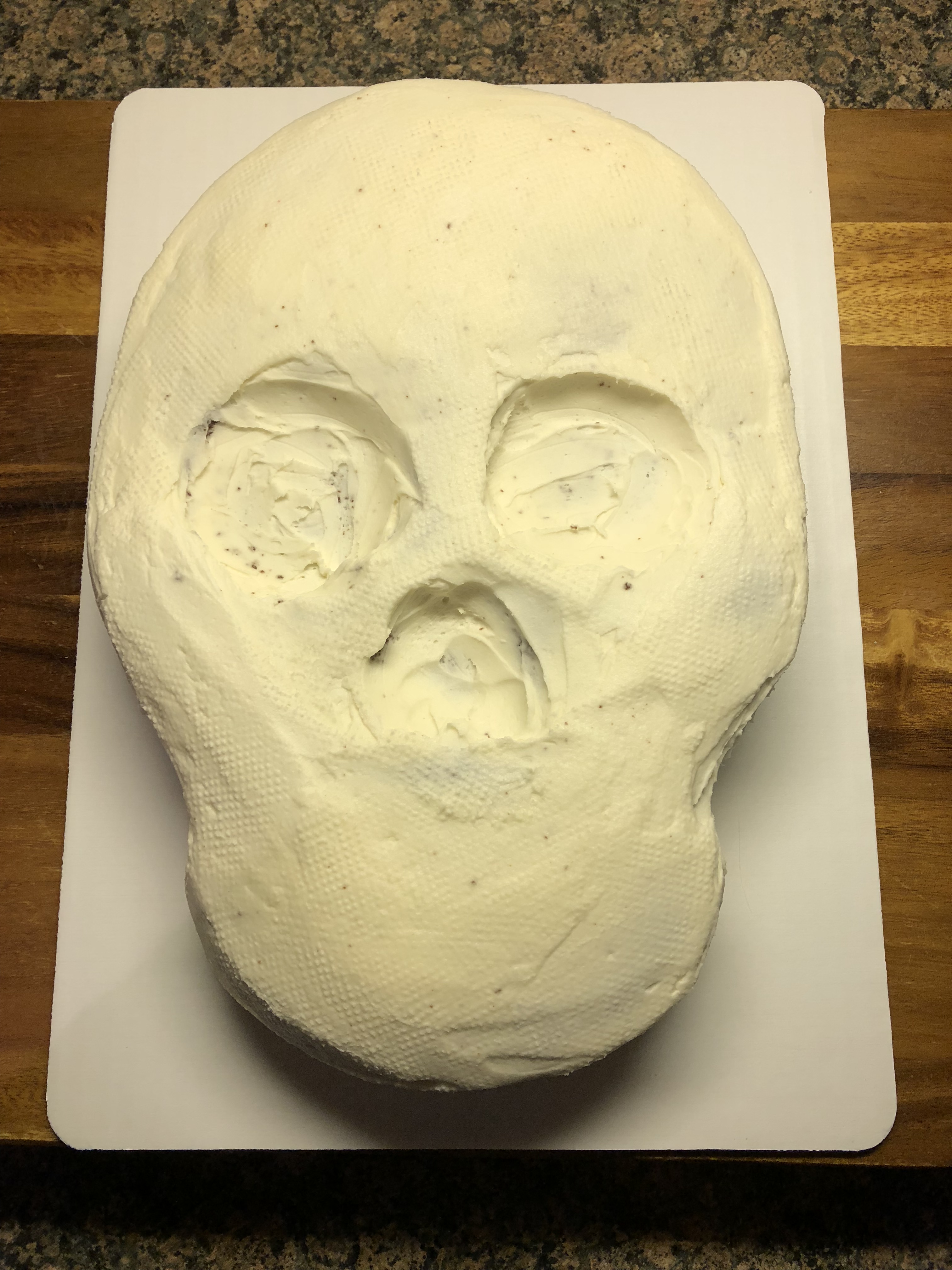 After 30 minutes I finished frosting the cake. I added a little extra frosting in the cheek area so the skull would have a more defined look. I then placed it back in the refrigerator so the frosting could firm up.