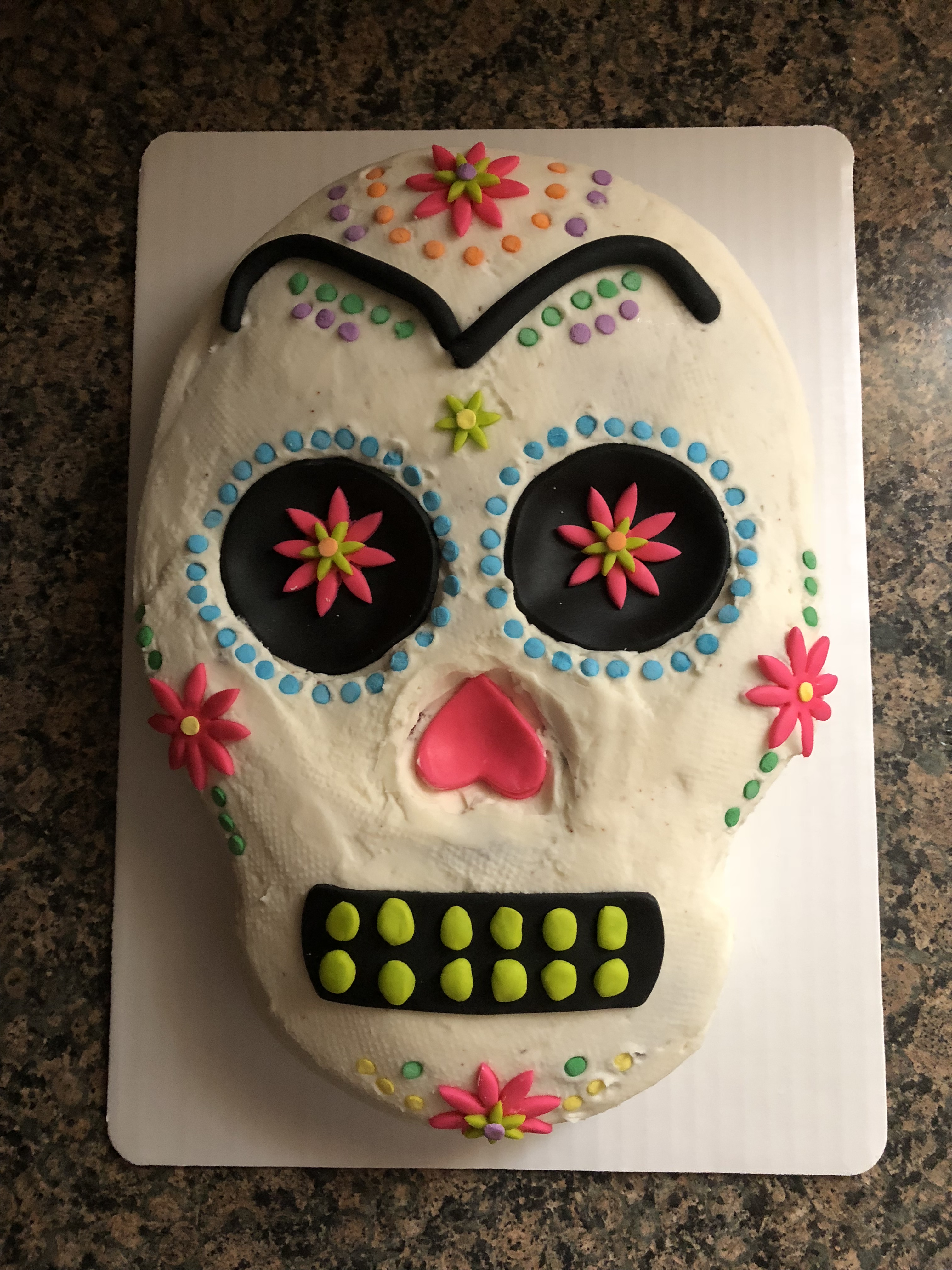 Feliz Dia De Los Muertos! Today is the final day of the three-day celebration to remember and honor loved ones who have died. If you want a little more info on the holiday check out my Dia De Los Muertos Cupcakes blog post. In celebration of the day I am sharing with you a Sugar Skull Cake. Sugar Skulls, or Calaveras, are often used to decorate the ofrendas (offerings) & gravestones during the three-day celebration. They got their name because they are traditionally made of clay molded sugar and then decorated with colorful adornments. The sugar skull I created definitely has sugar in it, but, not molded sugar. I opted to make a chocolate cake, frosted it with buttercream frosting and then decorated it with fondant and confetti sprinkles.