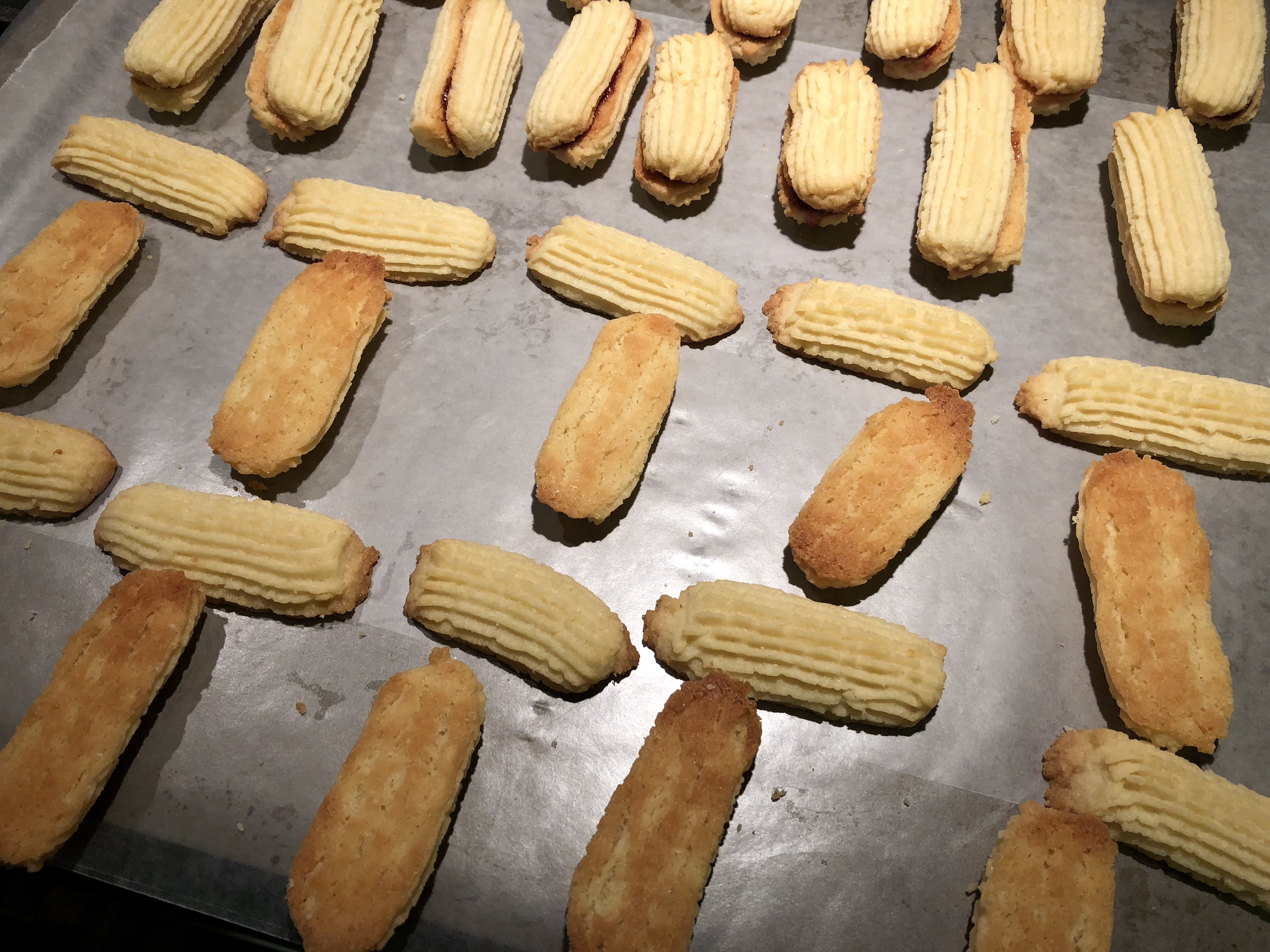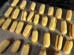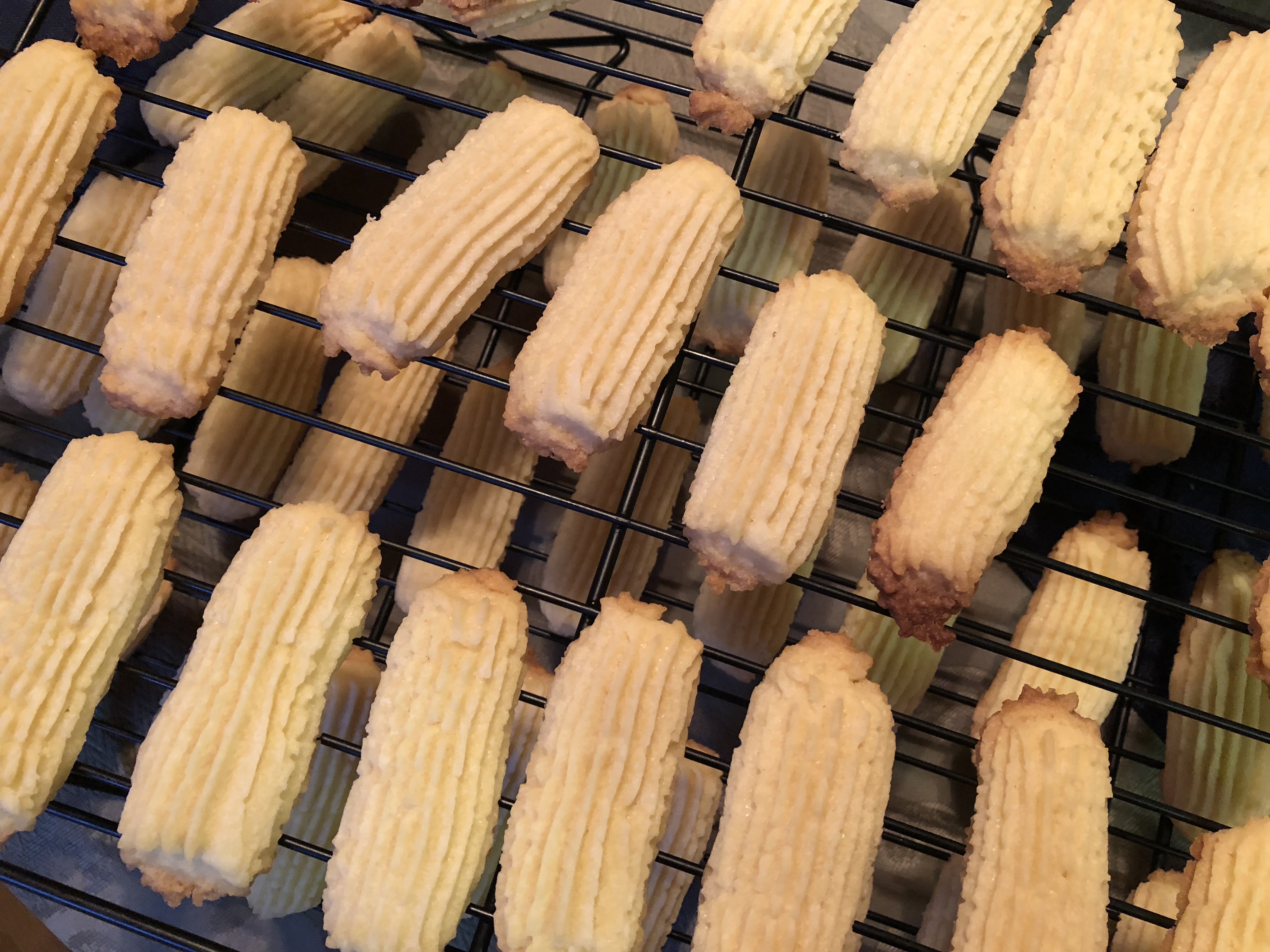 Pipe the dough into 2 inch long segments about 1 inch apart on the prepared baking sheet. You can use a knife or scissor to cut the pieces. Bake the cookies for 11 to 13 minutes, until they are golden at the edges.