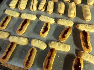 You may be slightly intimidated to make these cookies, but don’t be. They are super simple and don’t require any special ingredients. The hardest part is squeezing the dough out of the piping bag onto the prepared baking sheet. But after a few squeezes the dough softens up and it becomes easier and you soon get the hang of it. Using a Wilton 6B Tip I piped the dough into 2-inch pieces on a parchment lined cookie sheet. To end the dough for each cookie you can cut them with a knife or scissors. What I did is a little harder explain. I kind of nudged the tip into the cookie sheet to end it. I tried using a knife and it just wasn’t working for me. After you have piped all of your cookies bake them in a 350 F preheated oven for about 12 minutes. Let them cool completely and then the fun begins, the assembling.