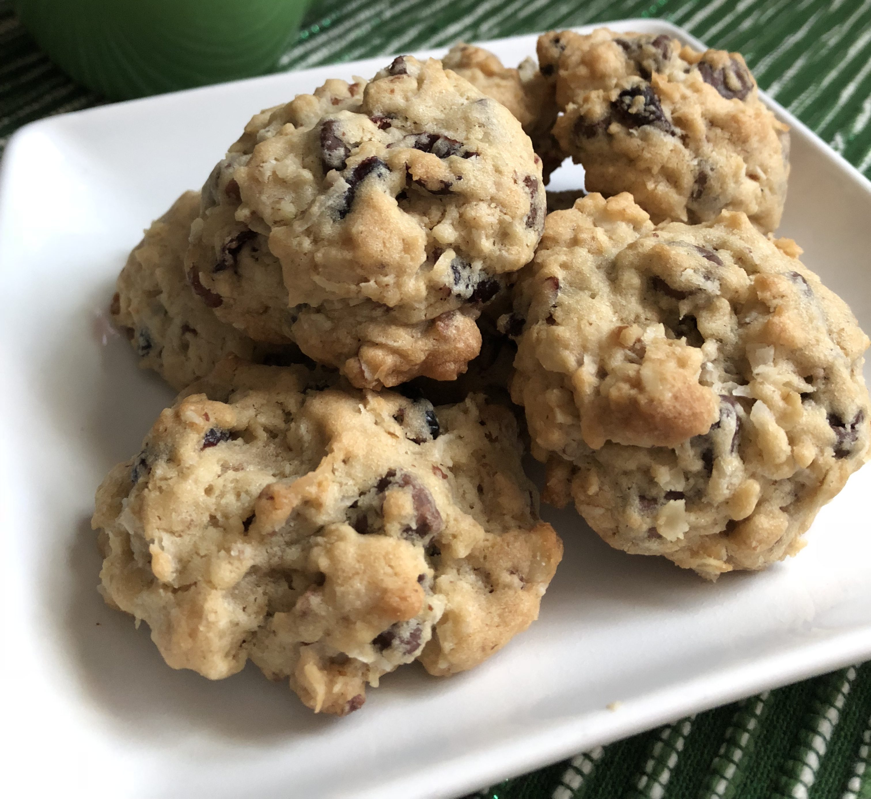 Welcome to day 4 of Cookie Palooza. Today’s cookie is basically a kitchen sink cookie. Don’t worry, there are no food scraps in this cookie, but, there are a bunch of add-ins, hence the kitchen sink analogy. There are pecans, dried cranberries, semi-sweet chocolate chips, milk chocolate chips, oatmeal and coconut. And while I know many people are not a fan of coconut (it seems people either love it or hate it) don’t fear, this cookie does not have a coconut flavor. The coconut adds texture to the cookie. And I am sure I may have lost some of you already as I know people are not always fond of a cookie with texture, especially a cookie like this that already has so much going on, but, trust me, all of the ingredients work so well together you will forget that there may be an ingredient or two you don’t like. Unless you have an allergy to one of them of course.