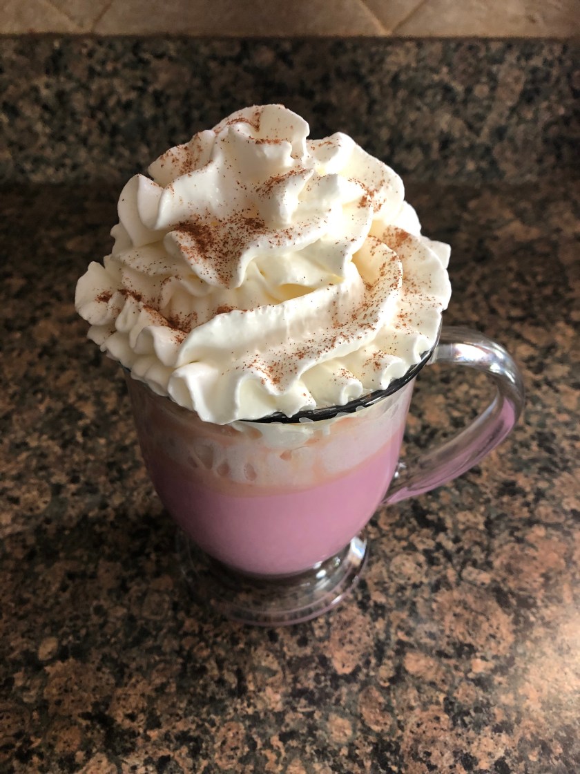 The base of this hot chocolate is white hot chocolate. You start off by bringing milk (I used whole milk) and salt to a simmer over medium heat. Then remove it from the heat and add in grated white chocolate and vanilla extract. Grating the chocolate allows it to melt easier and quicker. Once the chocolate has melted then stir in a few tablespoons of beet juice. But, if you are not inclined to use beet juice, you could substitute it with cherry juice or the juice from maraschino cherries. Just be aware that either of those options could make your hot chocolate a tad bit sweeter. Now, if none of those options work for you, you could tint the hot chocolate with a few drops of either pink or red food coloring. And finally, top the hot chocolate with a healthy topping of whipped cream and then sprinkle with cinnamon. YUM!