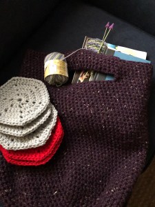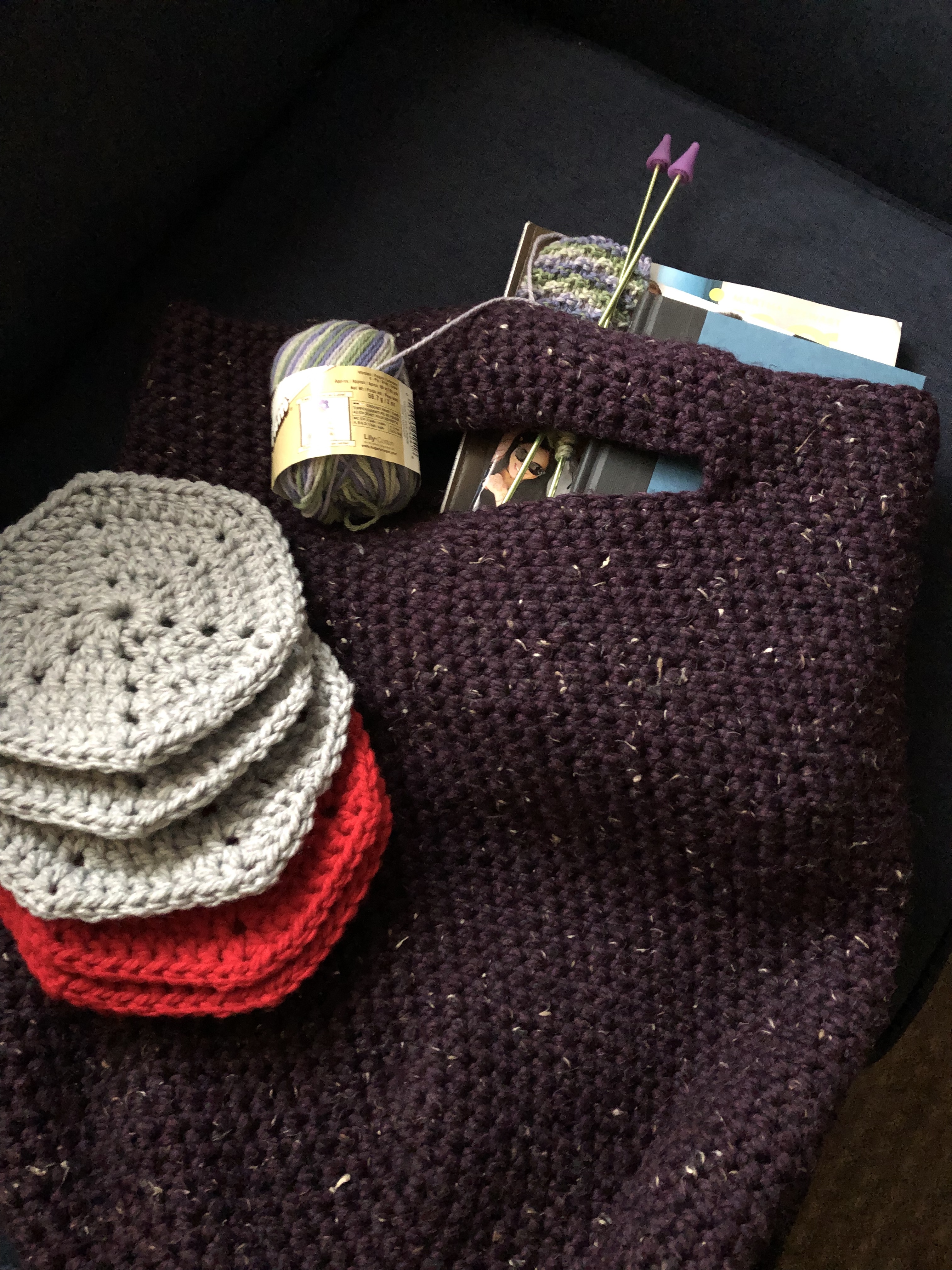 It’s the perfect size for me to carry around yarn projects, a book, magazines, etc…