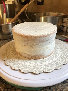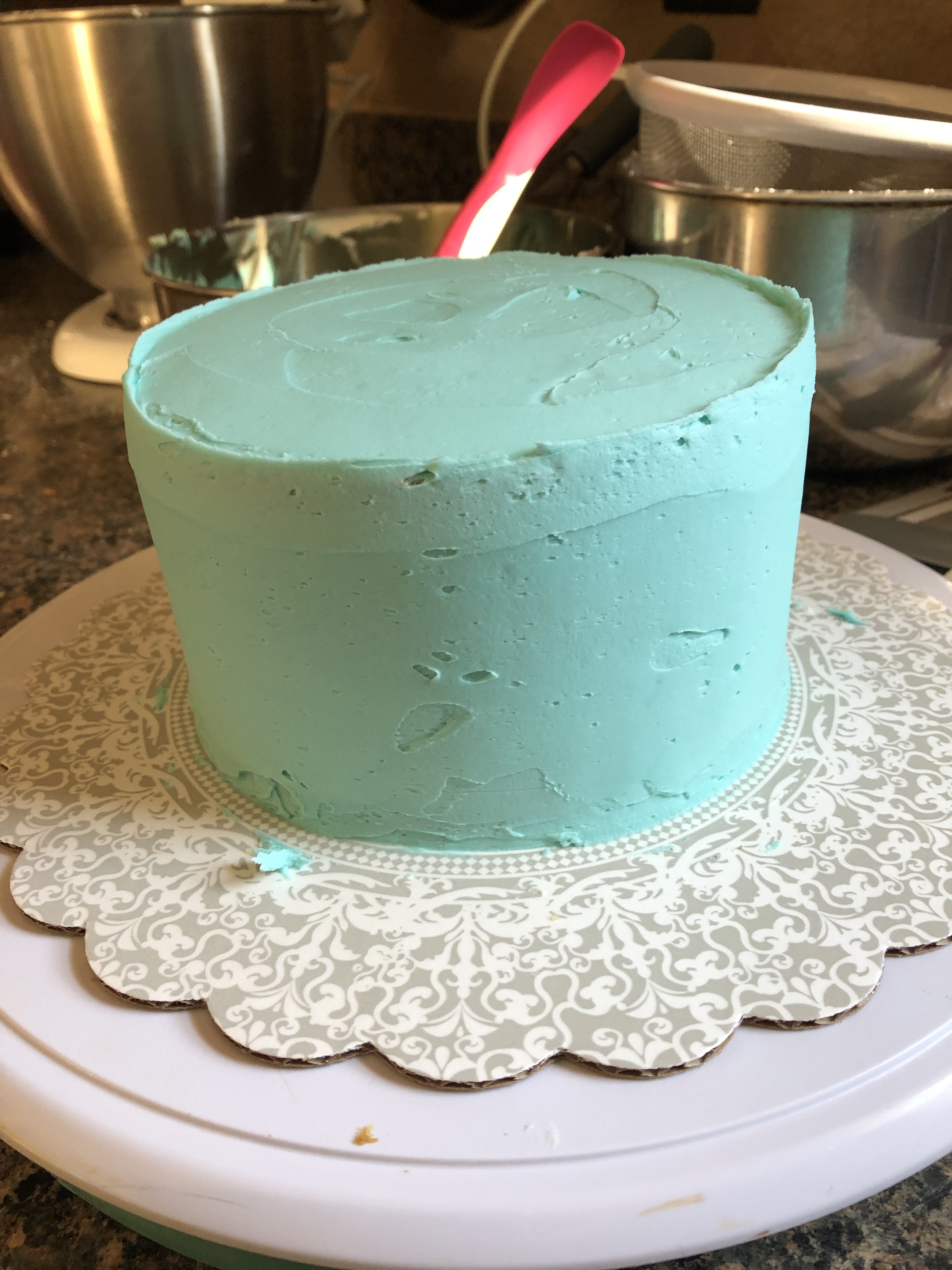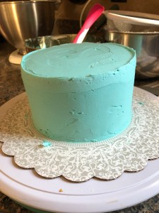 I then applied a generous amount of frosting to the cake and smoothed it as much as possible. I wanted a fairly thick layer of frosting around the cake for the next steps.