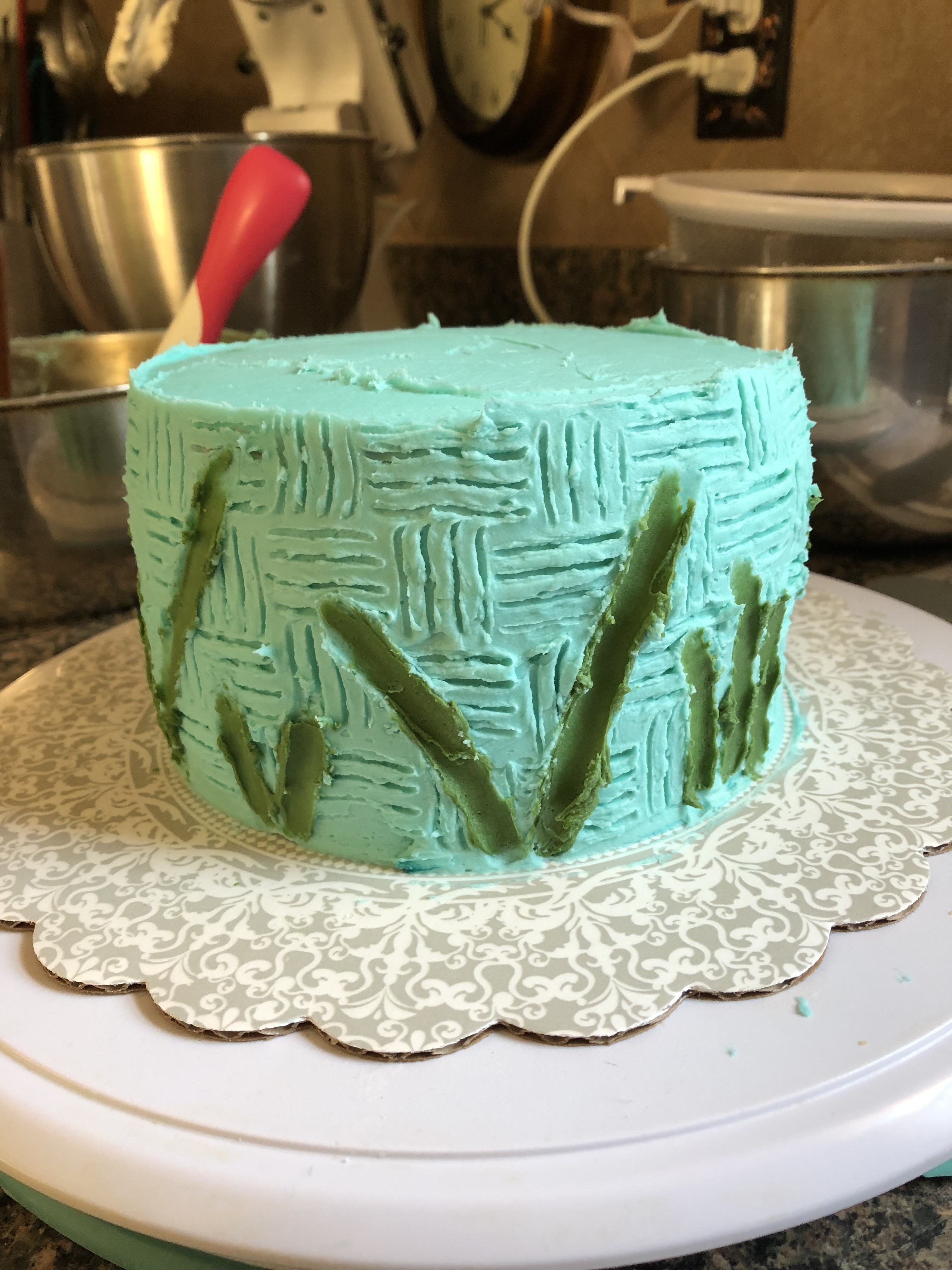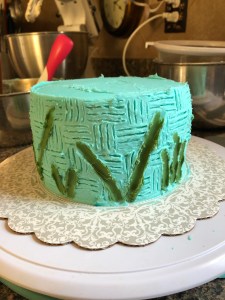 I then reserved about a tablespoon of the teal frosting and then tinted the remaining frosting green by adding in green gel food coloring. Using a tapered spatula and starting at the base of the cake I began dragging the tip of the spatula through the buttercream to create stems. Making sure not to press too deep as to touch the cake, but, going deep enough to create a channel. I passed the spatula through a few times to make sure it was deep enough making sure to wipe the spatula between each pass. I did this around the cake and even added in a few smaller channels between the larger stems.
