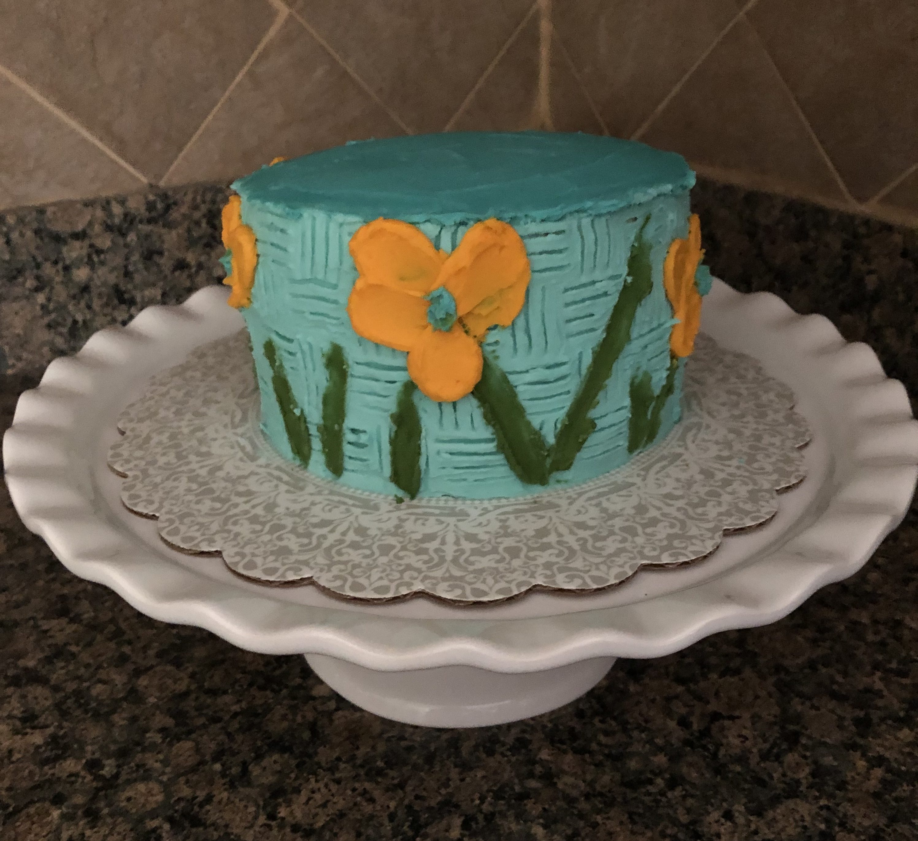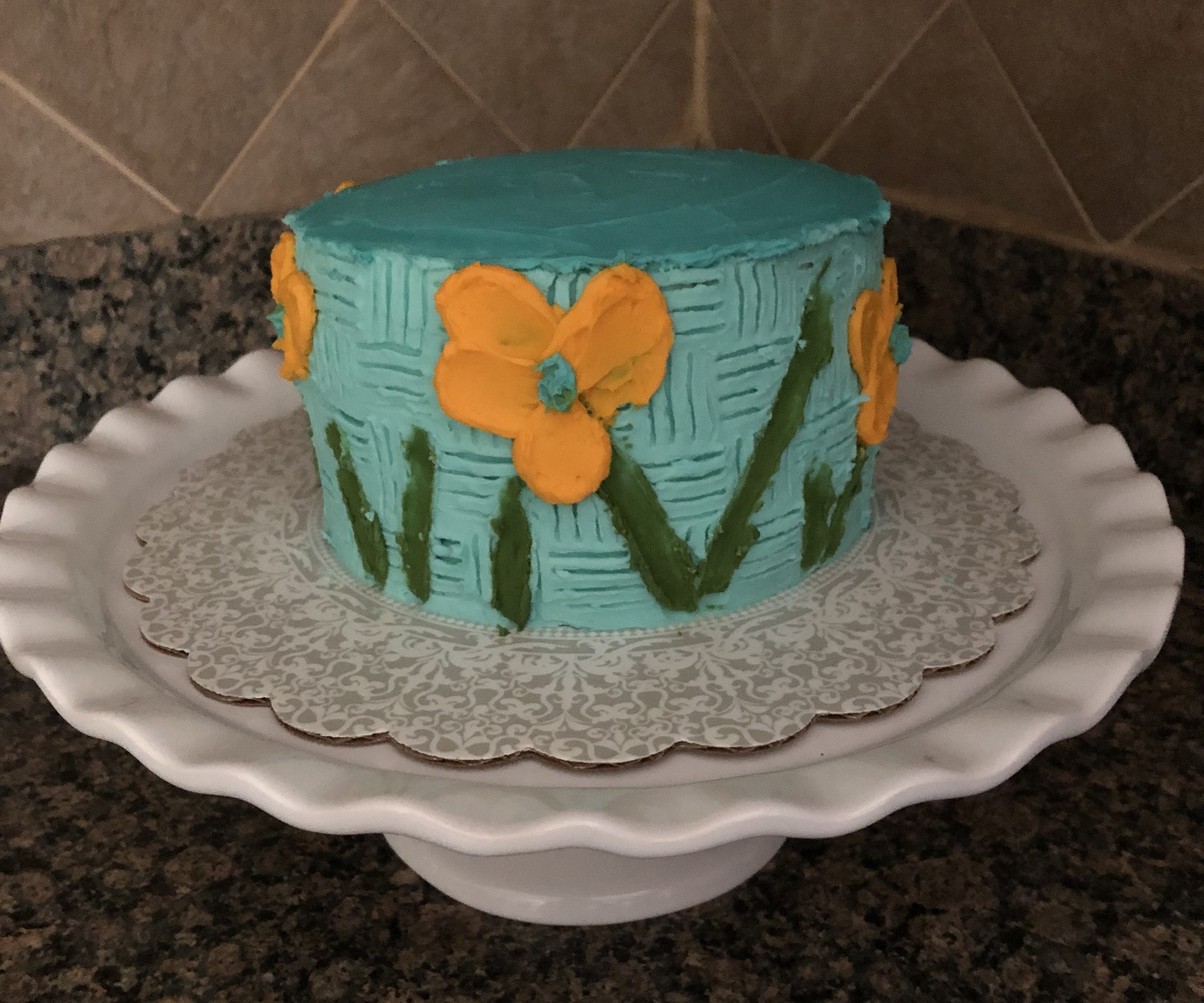 I used a yellow box cake mix to bake a two layer 6-inch cake. While the cake was cooling I whipped up a batch of my go-to Fluffy-Vanilla Frosting from Martha Stewart. I reserved about 3/4 cup of the frosting and then applied a thin crumb coat to the cake and then refrigerated the cake for about 30 minutes. While the cake was in the refrigerator I tinted the reserved 3/4 cup yellow and tinted the remaining frosting teal, for the background of the cake.