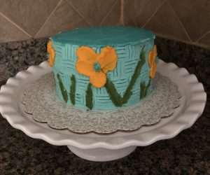 After the hour, I removed the cake from the refrigerator. Using the reserved yellow buttercream I painted flowers onto the cake. Using a rounded spatula I picked up a small dollop of yellow frosting and once again smoothed it with my fingers. I then pressed the dollop onto the cake and pulled the spatula away to create a petal. I continued doing this around the cake. I’ll admit, my petal didn’t come out exactly as I had hoped. This step actually reminded me of the pulled dot design on a cake. I actually wondered afterwards if it would have been easier to create the petals using that technique, although then the cake wouldn’t completely be a palette knife painted cake then.