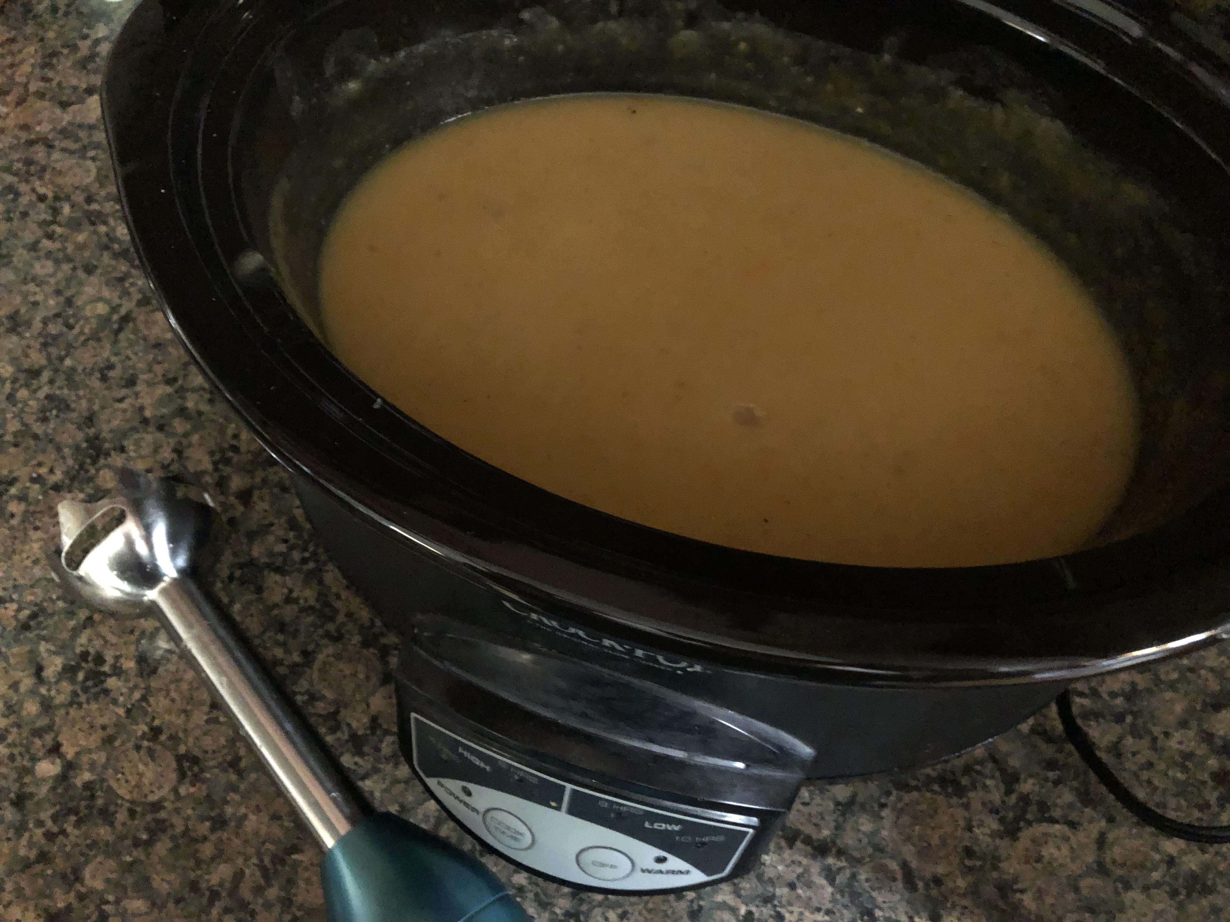And then, using my immersion blender I blended all of the ingredients together to create a creamy vegetable soup and then stirred in about 1/4 cup of heavy cream and seasoned it with salt and pepper.