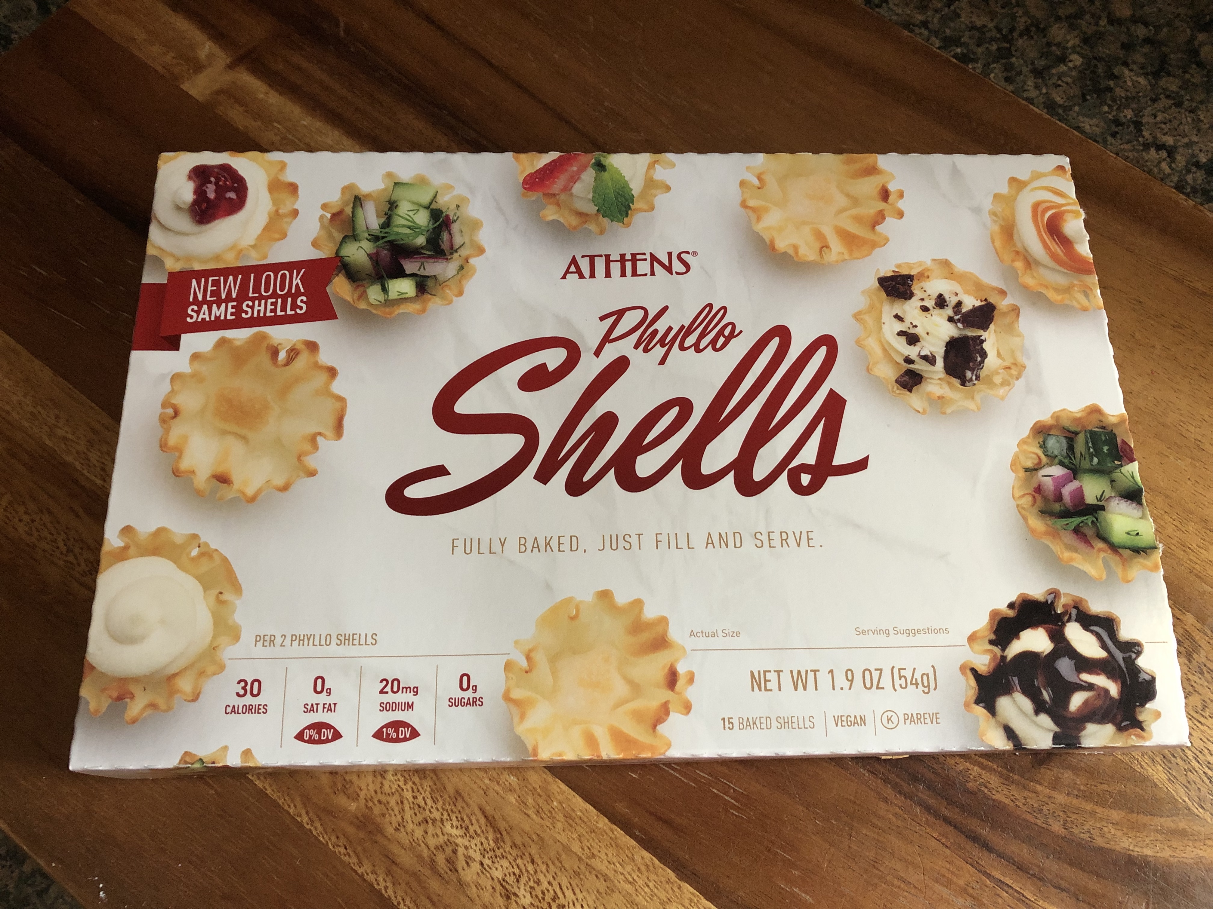 I found these phyllo shells at my local supermarket in the frozen food section. To prep the shells I simply placed them on a baking sheet and baked them in a 350 F preheated oven for four minutes to make them crispy.