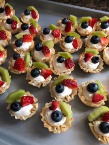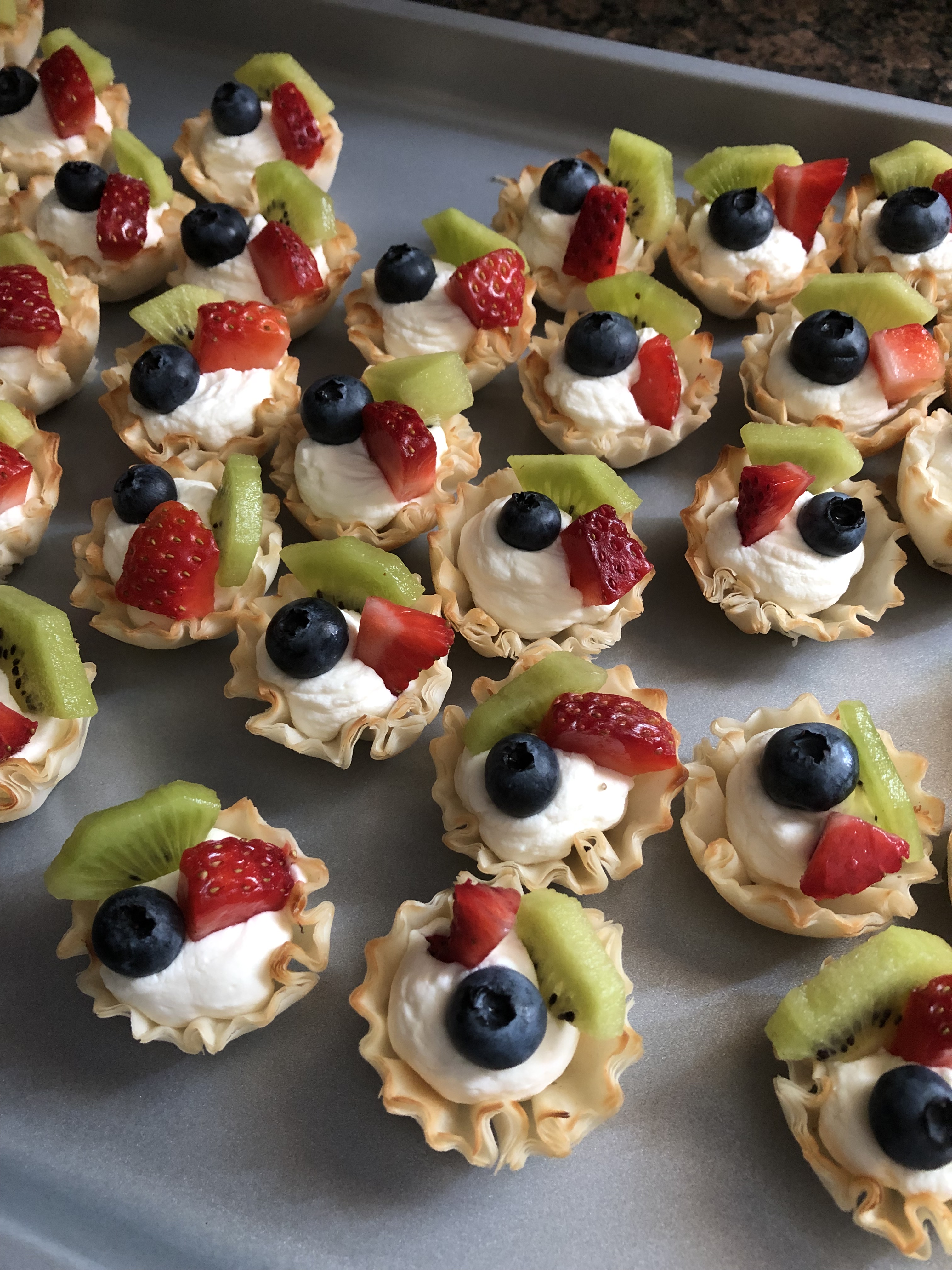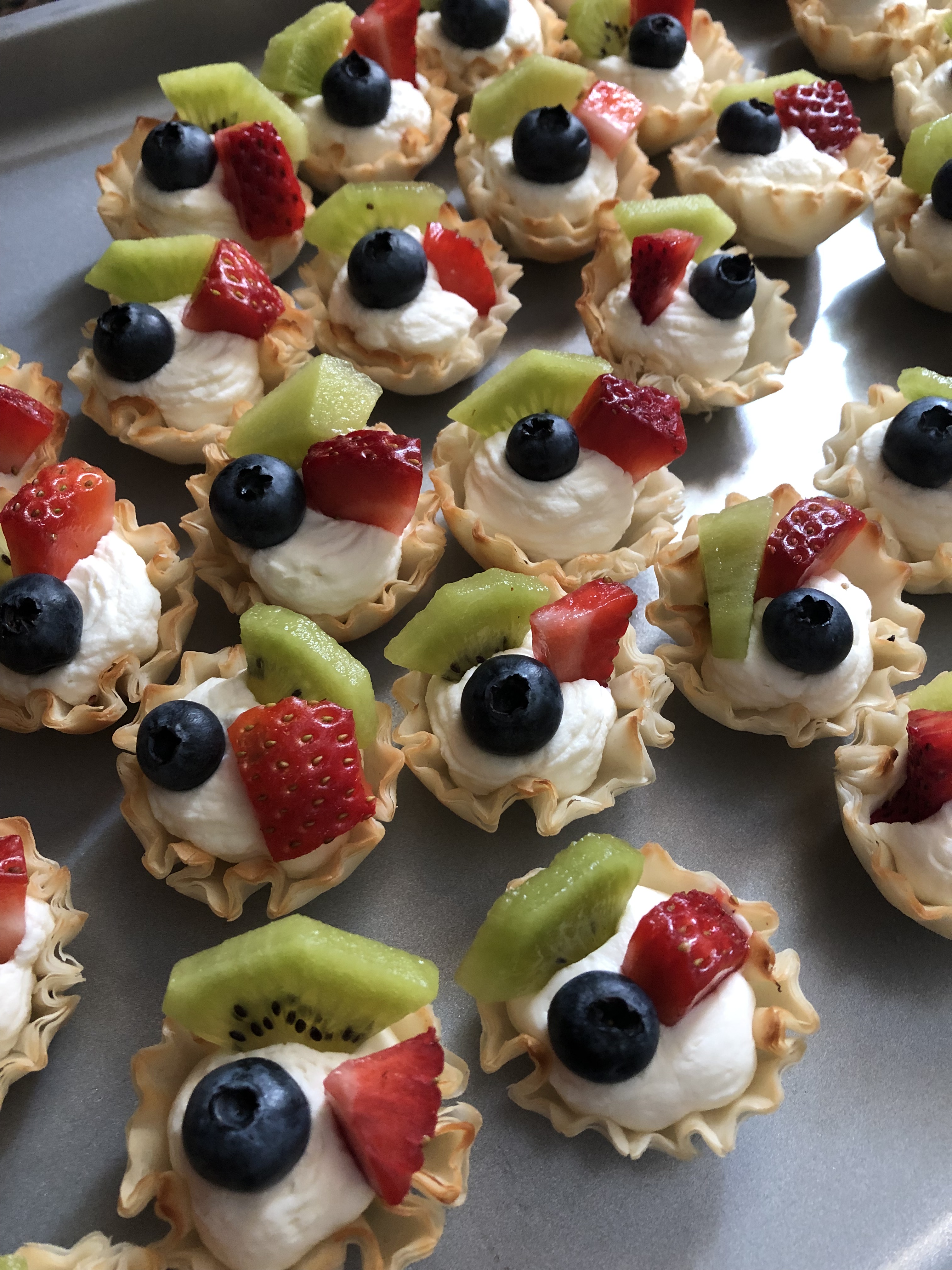While they were cooling I made the filling. I combined mascarpone cheese, heavy whipping cream and confectioners’ sugar in a large bowl and used a handheld mixer to beat the ingredients until stiff peaks formed. I transferred the mixture to a piping bag fitted with a medium-sized round piping tip and piped the filling into each of the shells, but, you could use a small spoon to spoon the mixture into them as well. I then placed the filled tarts in the refrigerator while I chopped up strawberries and kiwis to top them. Once the fruit was ready I topped each of the tarts with a piece of strawberry and kiwi and a blueberry. I honestly think that I had 45 tarts done in less than an hour. You can’t beat that!