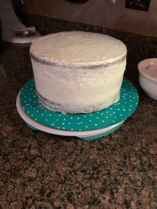 Now, for the cake. I had every intention of baking the cake from scratch, but, box cake was on sale the week before and when you are planning on decorating a cake the same weekend you have a long list of other things to get done around the house the easy road is the way to go. I wanted the cake to have some height so I baked four 9-inch cakes using two boxes of Devil’s Food cake mix. I opted to use three of them and kept the fourth one to snack on. I made the cakes the night before and then wrapped them in plastic wrap and stored them in the refrigerator.