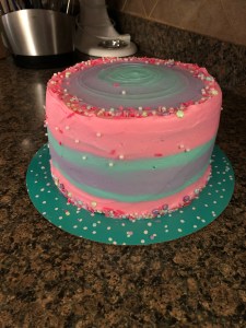 Once the cake was ready I piped the frosting around and on top of the cake, smoothed it and then sprinkled some sprinkles on it. At this point I placed it back in the refrigerator so I could finish decorating it the following day.