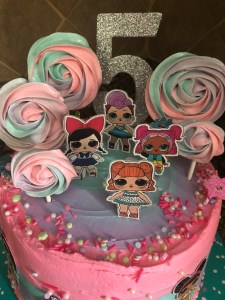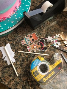 The next day it was time to decorate. I had searched online for L.O.L Surprise! cut-outs and while I did find some that cost about $10, I also found a website with free clip-art. So, I decided to save my $10 and printed the clip-art out on cardstock and then cut out the dolls myself. Here’s a pic of my very technical way of getting the L.O.L Surprise! paper dolls on the cake. I place a piece of double-sided tape on the back of them, placed a lollipop stick on it and then used regular tape to hold it all together… it worked! I also placed a few of the cut outs on the front of the cake. For those pieces I taped a piece of wax paper behind them before adhering them to the cake with left-over frosting.