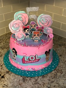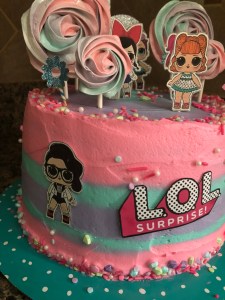 This year for my youngest niece’s birthday she requested an L.O.L Surprise! themed birthday cake. And just in case you don’t know, L.O.L Surprise! are mini dolls that come in a toy ball. You have to peel away the layers of the ball to get to the doll. The layers include stickers, the dolls clothes and accessories and finally the doll. The surprise is not knowing what doll is in the ball. Oh and a little FYI the L.O.L stands for Lil Outrageous Littles. Granted, they have evolved into more than just a mini doll in a ball. They now come in different sized balls, big surprise balls, pets, and so forth. These toy makers have to strike while the iron is hot on any toy. The first themed cake I ever saw for the toy was a round ball similar to the ball the dolls come in. I wasn’t going to attempt something that extreme. I opted to go for something a bit simpler, but, still echoing the whimsical and fun nature of the dolls.