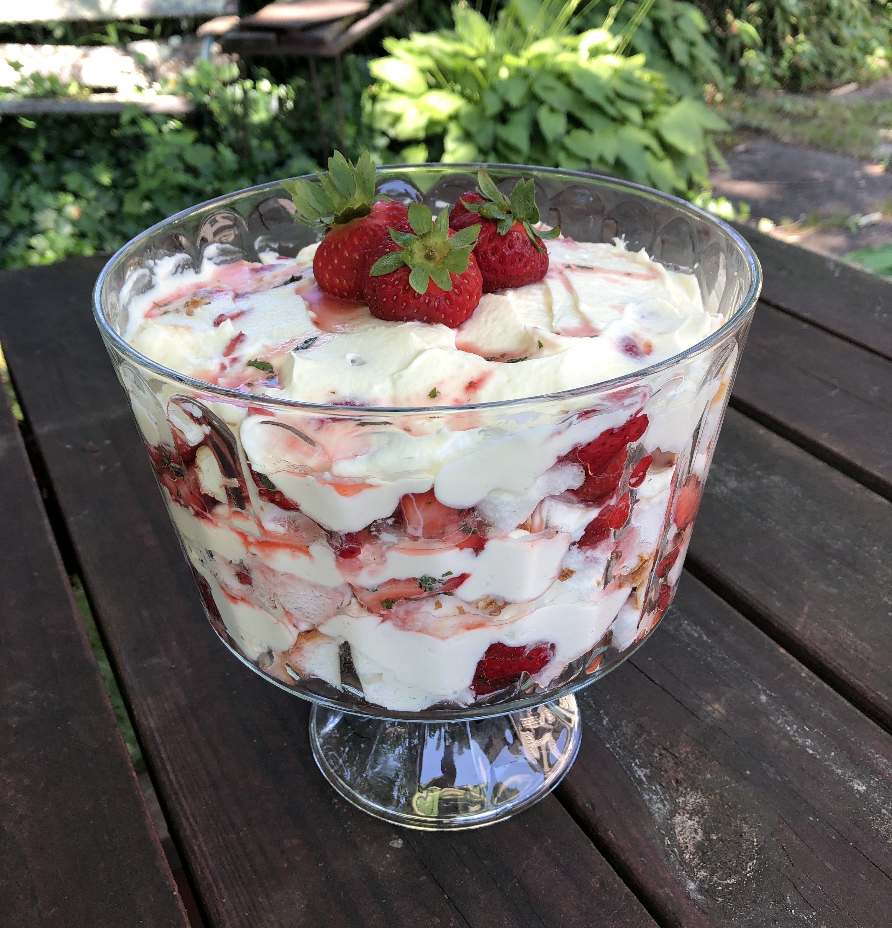 And for the first time ever I made a trifle. It had layers of Angel Food Cake, Mascarpone Whipped Cream and Mint Macerated Strawberries. I took a major time-saving shortcut and used a store-bought Angel Food Cake as opposed to baking one from scratch. If you’re not keen on Angel Food Cake, a Pound Cake would be a nice substitute. And, if you don’t have a trifle bowl you could use a large flat-bottomed glass bowl.