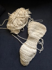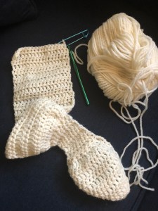 So, I picked a yarn that was similar in weight to the yarn I planned on using for the actual scarf. And I must say actually working on something with your hands as opposed to reading and imagining how to do it are so opposite. Once I had the yarn and crochet needle in my hand the pattern made sense and the scarf was a cinch to crochet. I decided to work thru the pattern from the first leaf, to making the keyhole and then a bit of the neck (all those words that through me for a loop at the beginning.) Once I got to a decent point I showed the sample to the recipient of the final product and they were happy with it. I then went and purchased the actual yarn.