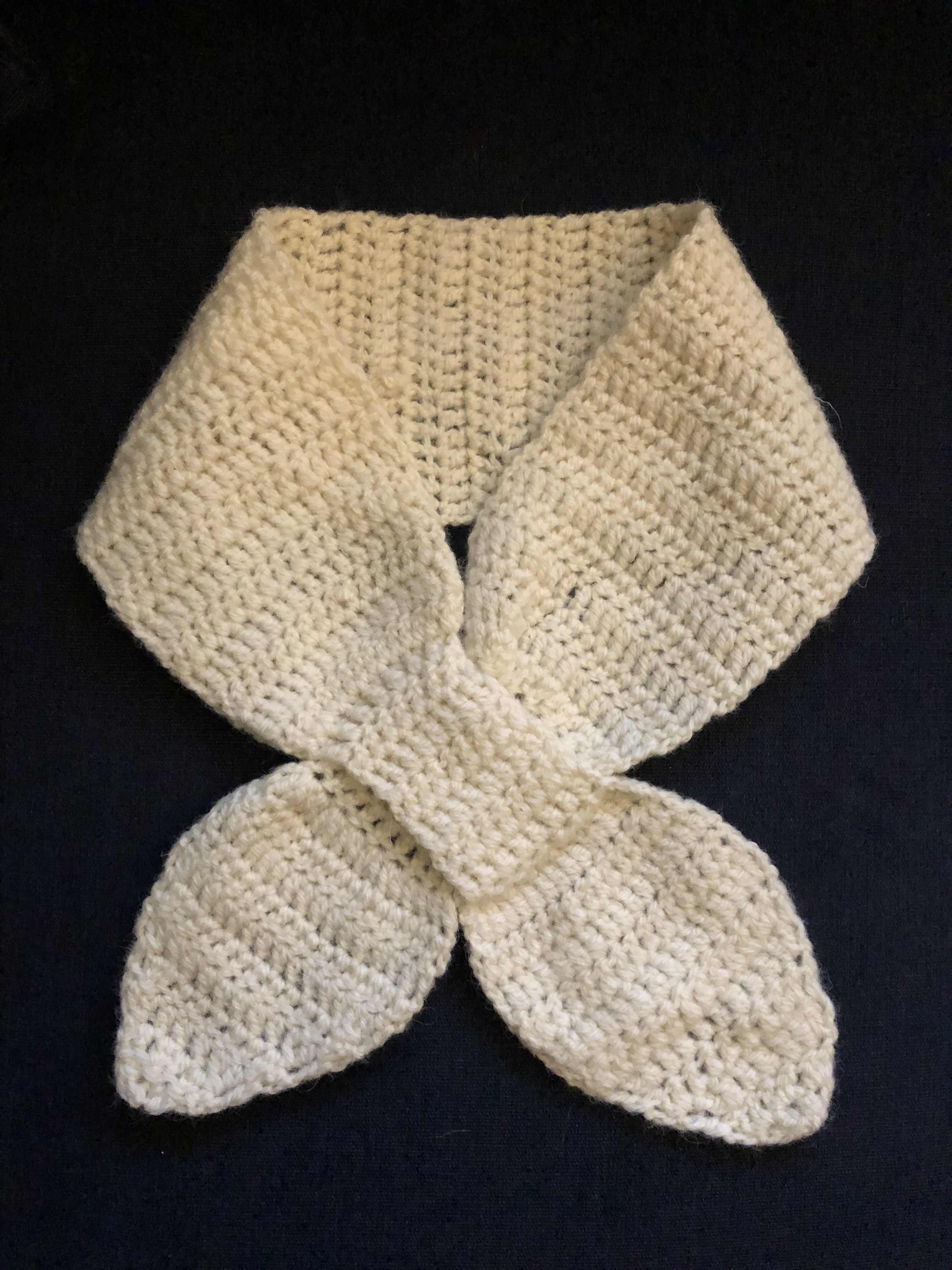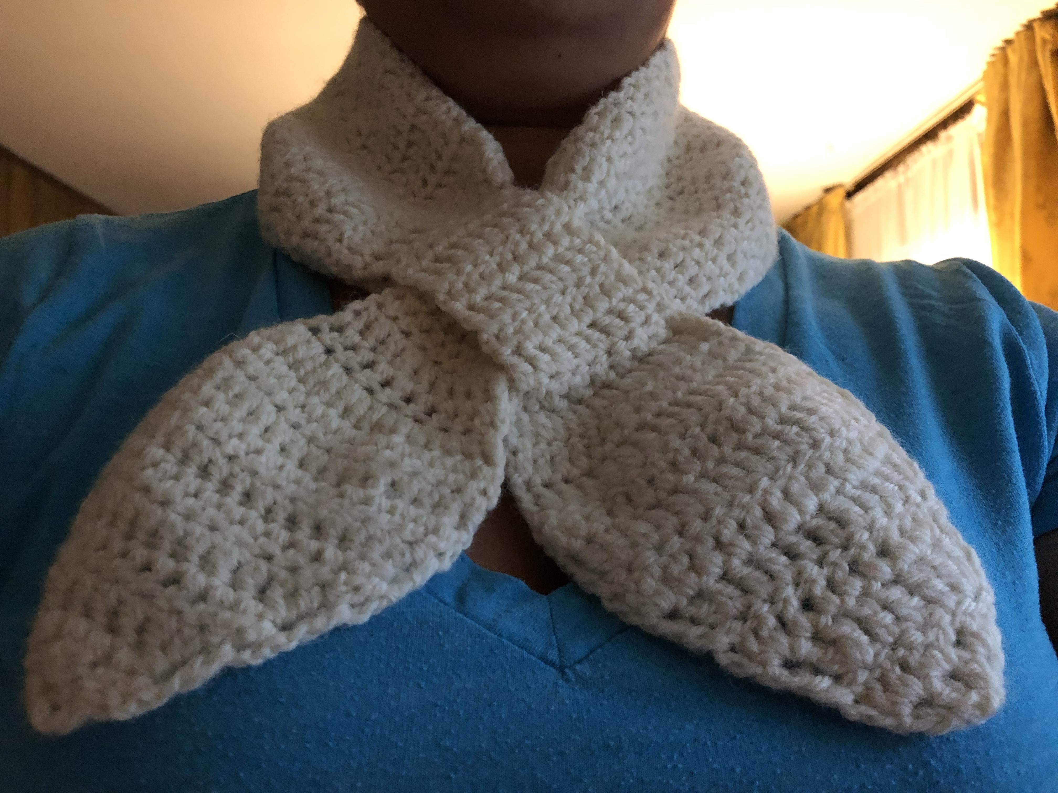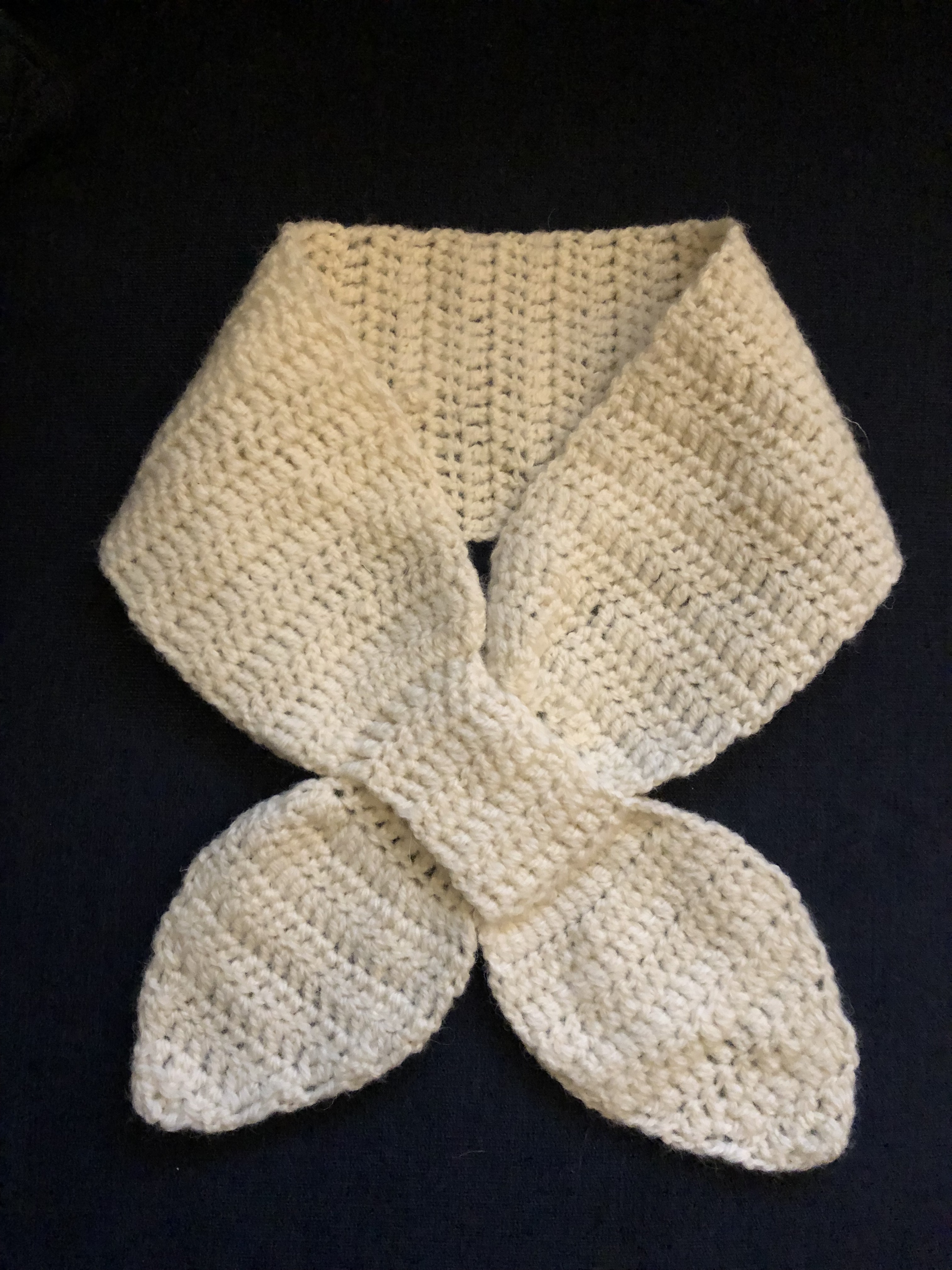 Earlier this year I got a request to make a keyhole scarf (it can also be referred to as an Ascot scarf). It’s a short scarf that sits at the upper chest. As opposed to other scarves this style stays put because one end is inserted into the keyhole of the other. Since I truly had no clue how to make one I started looking for patterns online similar to the picture of the one requested. Once I found a pattern I set it aside figuring I would have time to make it by the deadline of September. Eventually I picked up the pattern to give it a good read over and instantly got worried. I wasn’t sure if I would be able to actually make it. The words leaf, keyhole and neck in the pattern through me for a bit of a loop. I decided though that I would practice on some extra yarn that I have stored away – I have a bin of yarn in my basement with remnants from past projects. I clean it out every now and then because I realized you don’t really need a few yards of random shades of yarn.