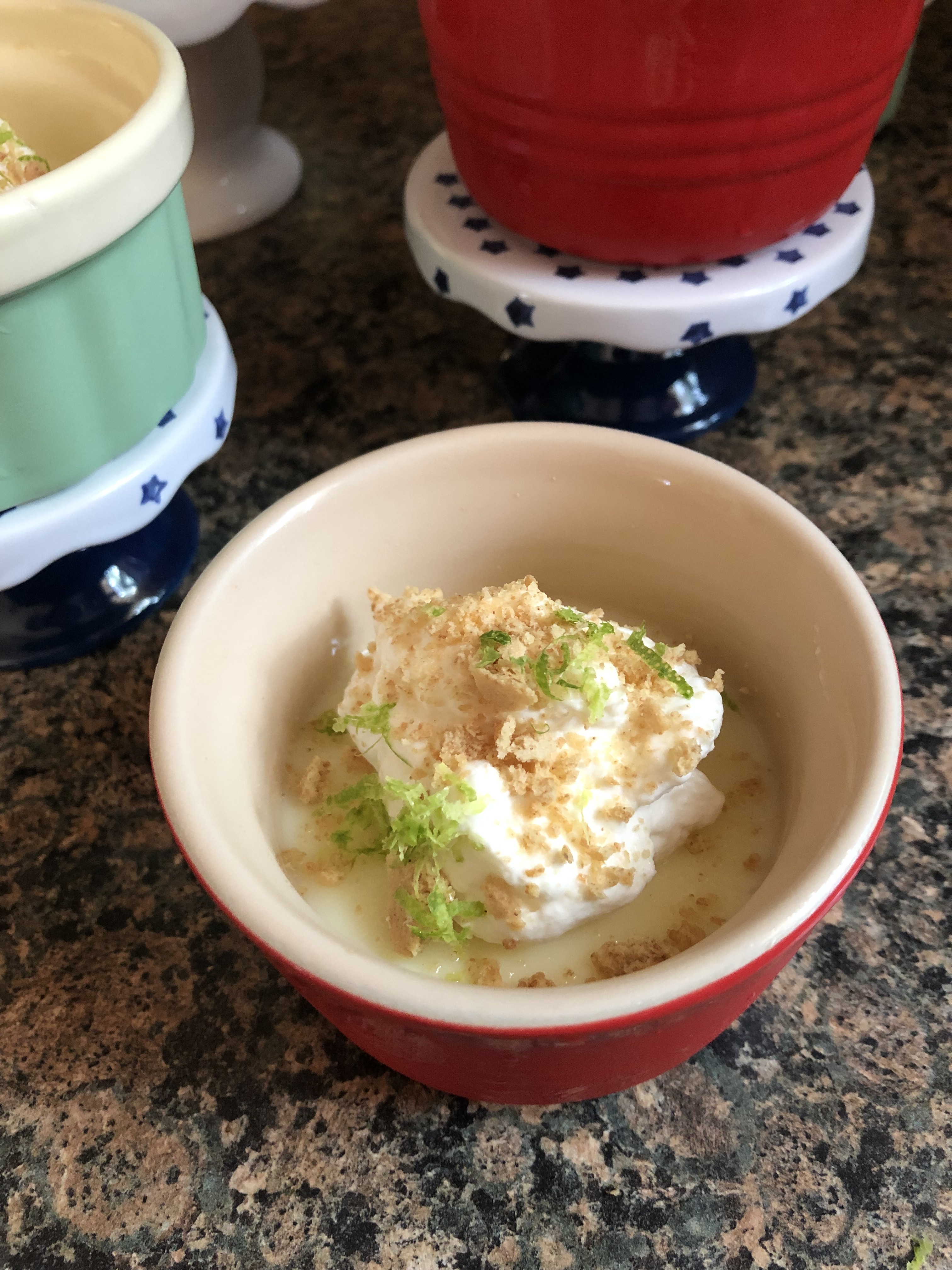 Once the pudding is set, top each one with a dollop of whipped cream, some of the crushed graham cracker and lime zest.