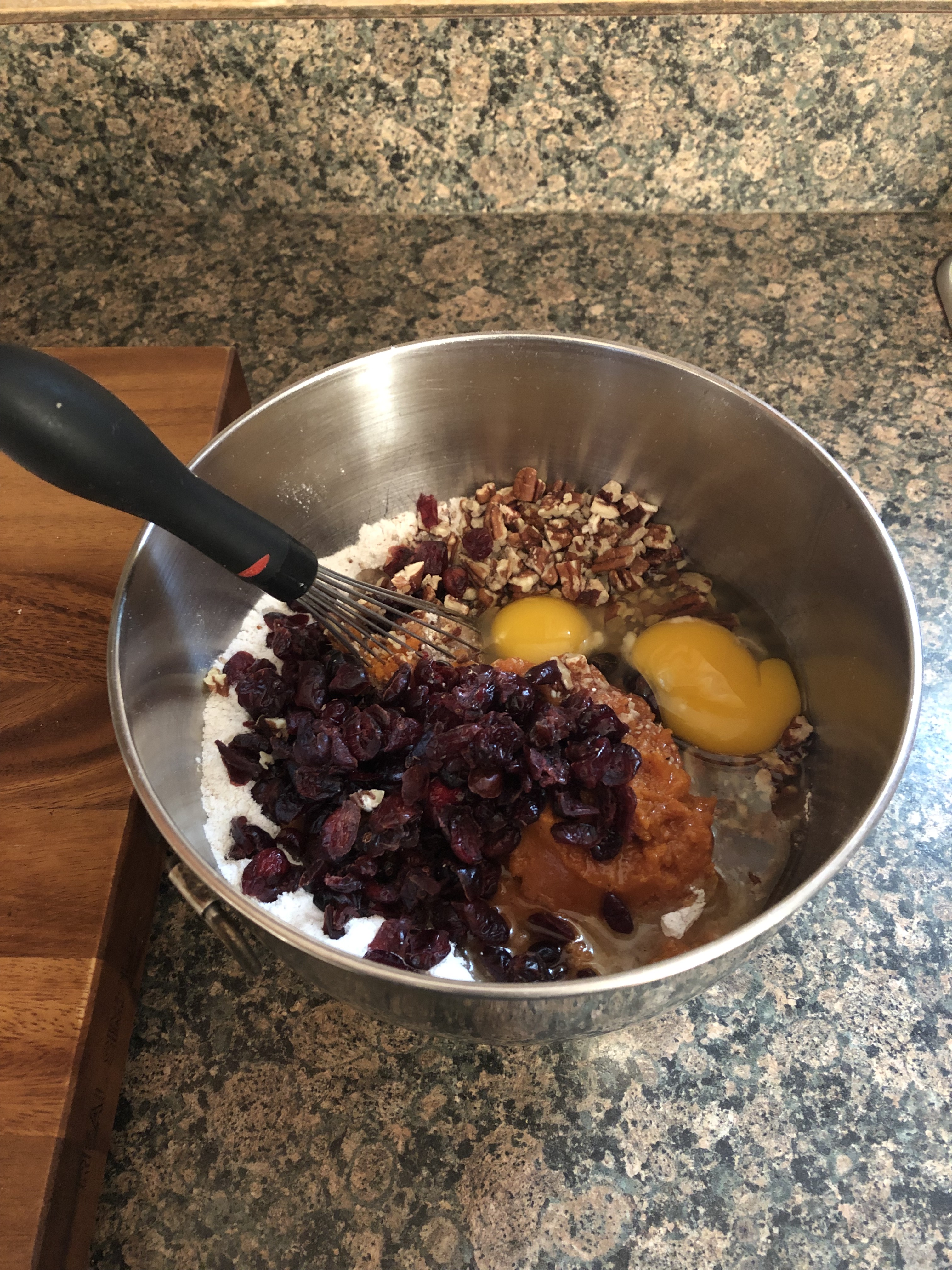 In a large bowl whisk together the dry ingredients – flour, sugar, baking powder, pumpkin pie spice and salt. Add in the pumpkin puree, oil, eggs, cranberries and pecans and using a handheld mixer on the low setting beat the mixture until just combined. Do not overmix.