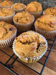 After mixing the ingredients until they were just combined I divided them into a muffin tin lined with cupcake liners – about 1/4 cup of batter in each. The recipe called for 12 muffins, but, I ended up with 15. To ensure that the remaining three baked well I filled the empty cavities of that muffin tin with water about half-way up. I then sprinkled some of the muffins with coarse sugar.