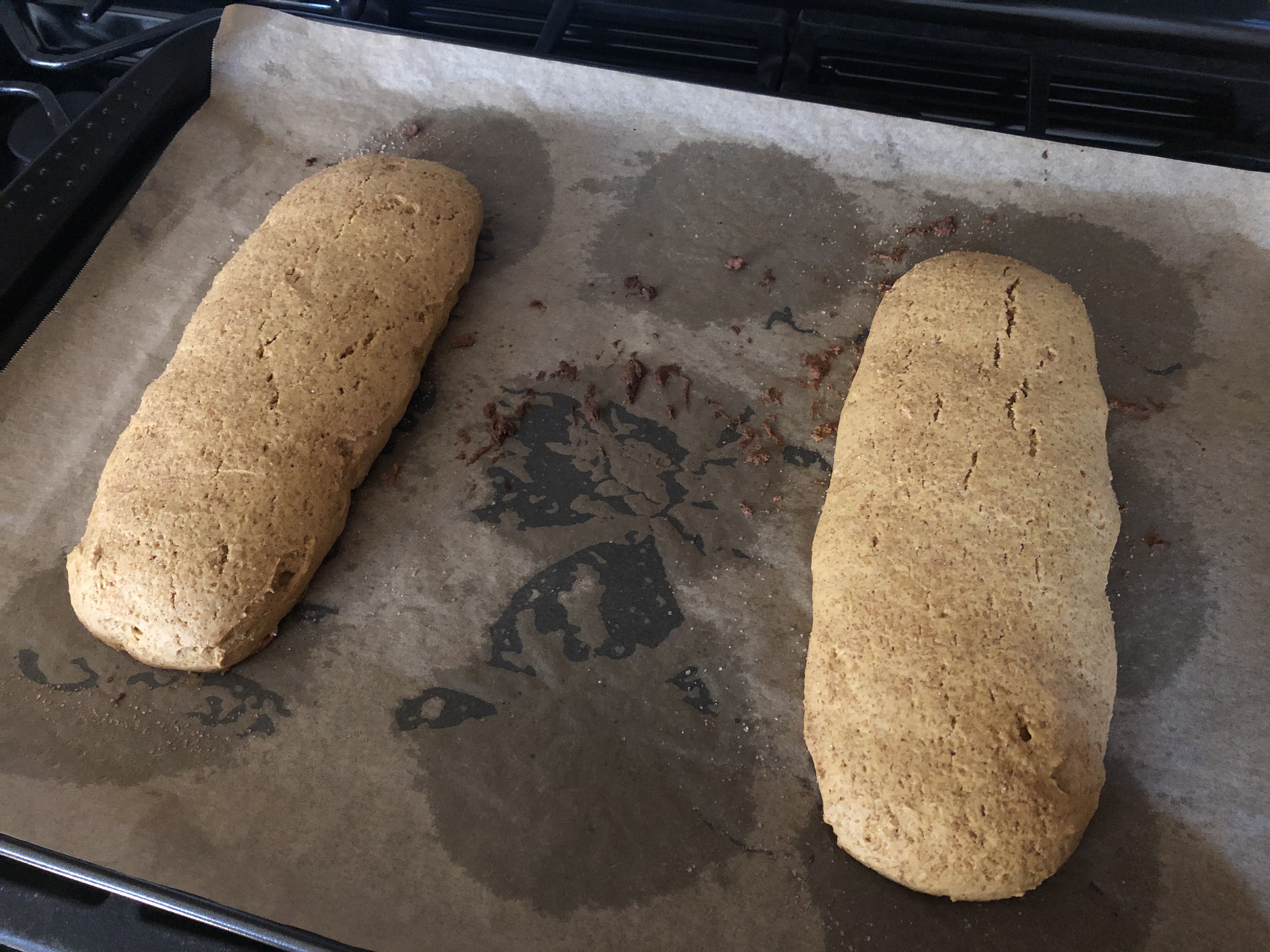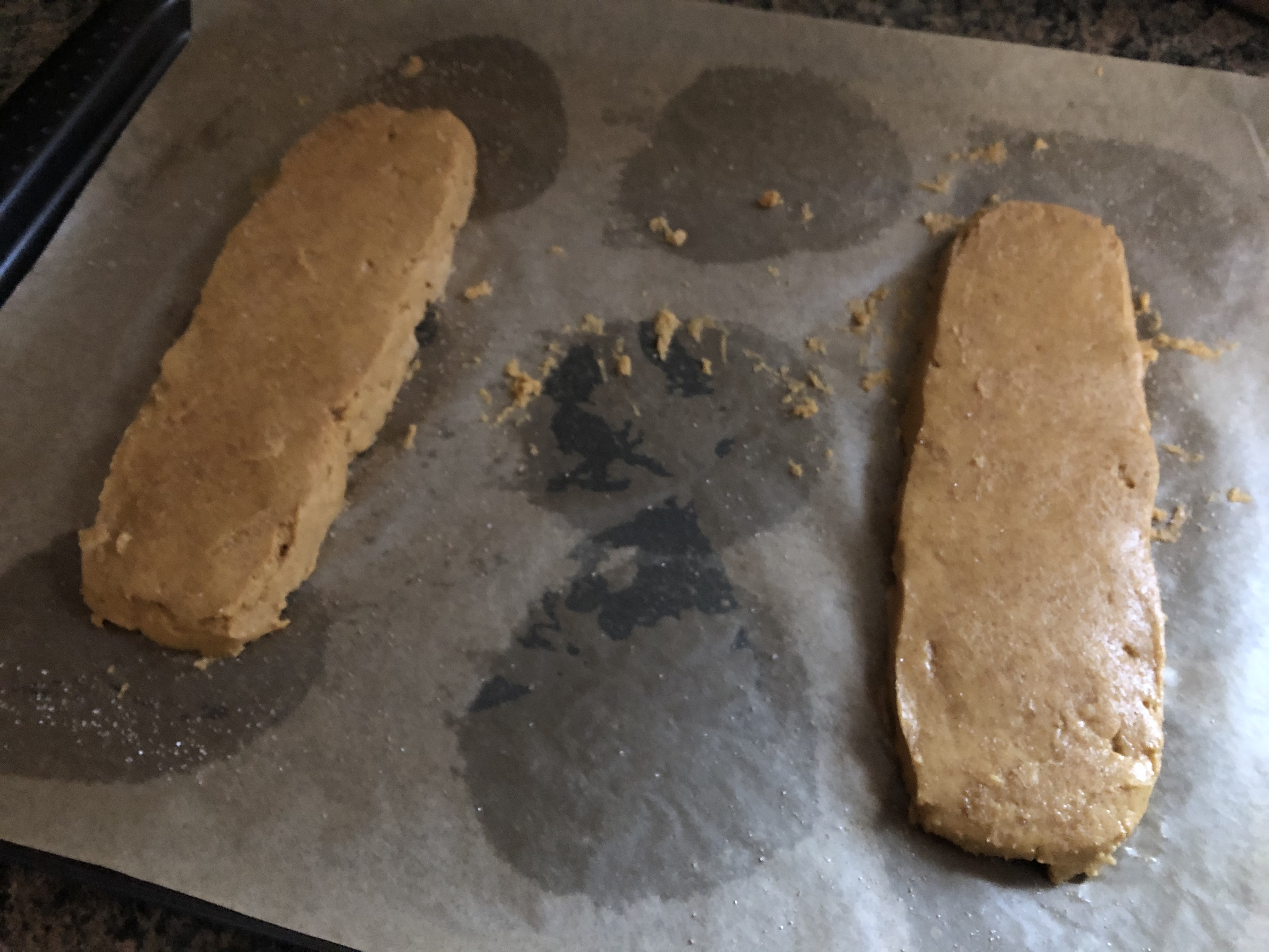 I transferred the dough to a baking sheet I lined with parchment paper. And yes, I had used that parchment paper before. I was baking chocolate chip cookies prior to making the biscotti. I simply flipped the parchment paper over and used the other side for the biscotti. And in case you are wondering or weren’t aware, it’s perfectly safe to use parchment paper more than once. Just make sure if you are gifting the cookies to anyone they don’t have any allergies that could be affected by a different batch of cookies you made. Since the dough was sticky I did my best to form it into two rectangles. The recipe said 10 x 2 1/2, I ended up with 9 x 2 1/2. I did my best to get it to 10 inches, but, it wasn’t happening.