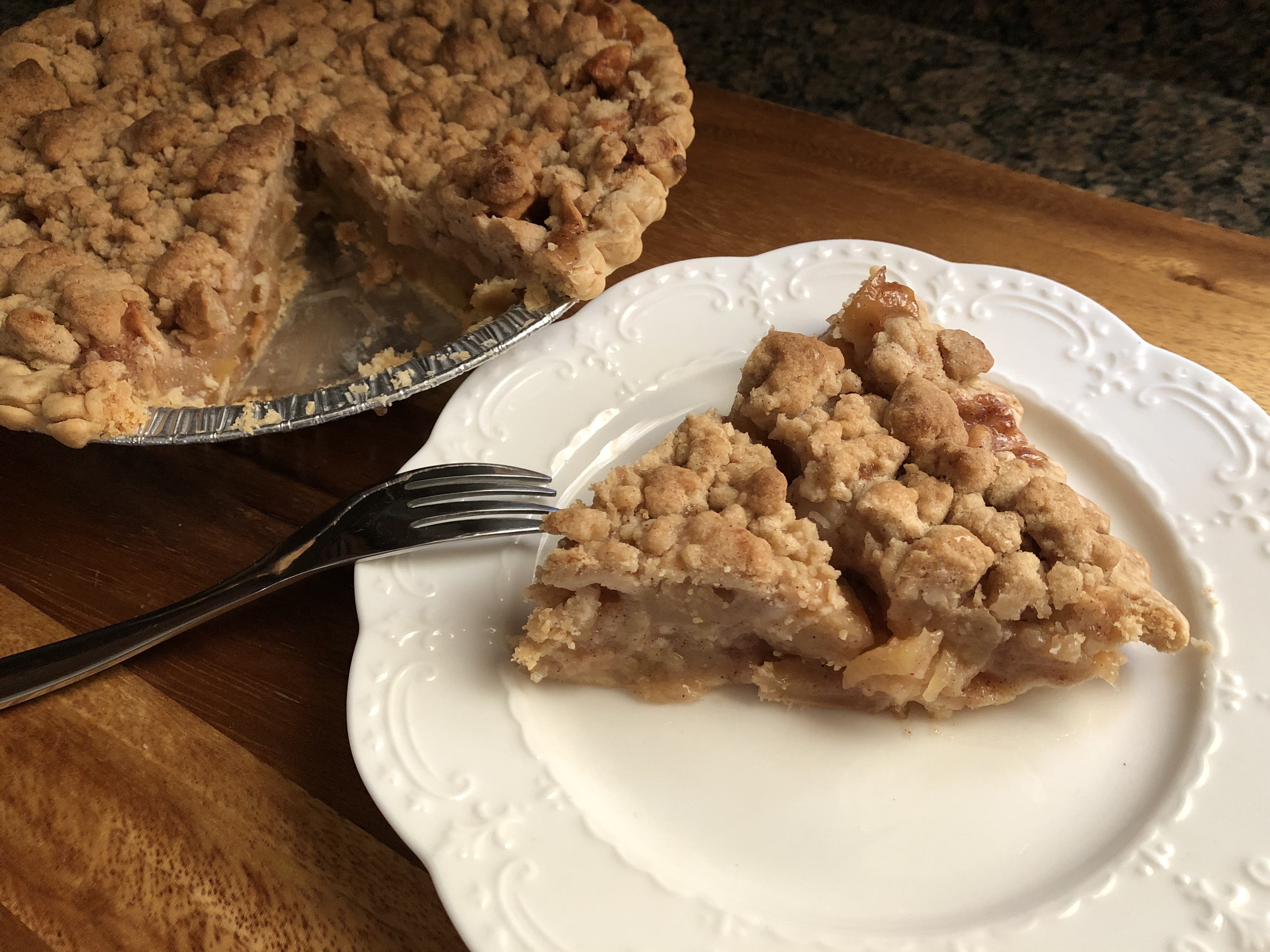 Place the pie on the baking sheet in the oven and bake until the crumbs lightly brown, about 25-30 minutes. Reduce the oven temperature to 350 F and continue baking until the apples are completely soft when pierced with a knife, about an additional 60 to 80 minutes. If you find the crumb topping is getting too dark cover it loosely with a piece of aluminum foil. Transfer the pie to a wire rack to cool completely.