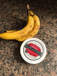 I recently picked up a bunch of bunch of bananas on one of my runs and I always make the mistake of getting a few too many or not eating them fast enough. I prefer my bananas to not have any spots on them. So, with three overripe bananas staring at me I decided to make a banana cake. And initially I was thinking of making a whipped cream frosting to top it, but, then I remembered I had a slightly used container of mascarpone cheese in my fridge that was quickly approaching its expiration date, so I decided to make a Mascarpone Whipped Cream frosting instead. Now, I wasn’t all that sure how the two flavors would go together, but, since mascarpone is closely related to cream cheese (both are essentially the same but mascarpone has a higher fat content than cream cheese, hence it having a richer and creamier taste) and a lot of banana cakes do have a cream cheese frosting I figured they would work together. So, if you don’t have either mascarpone or whipped cream on hand but you do have cream cheese and confectioners’ sugar you could easily just make a cream cheese frosting to top the cake. Or, to make things even easier, and just as delicious, you can enjoy the cake on its own without frosting. Hopefully that wasn’t too much information or rambling.