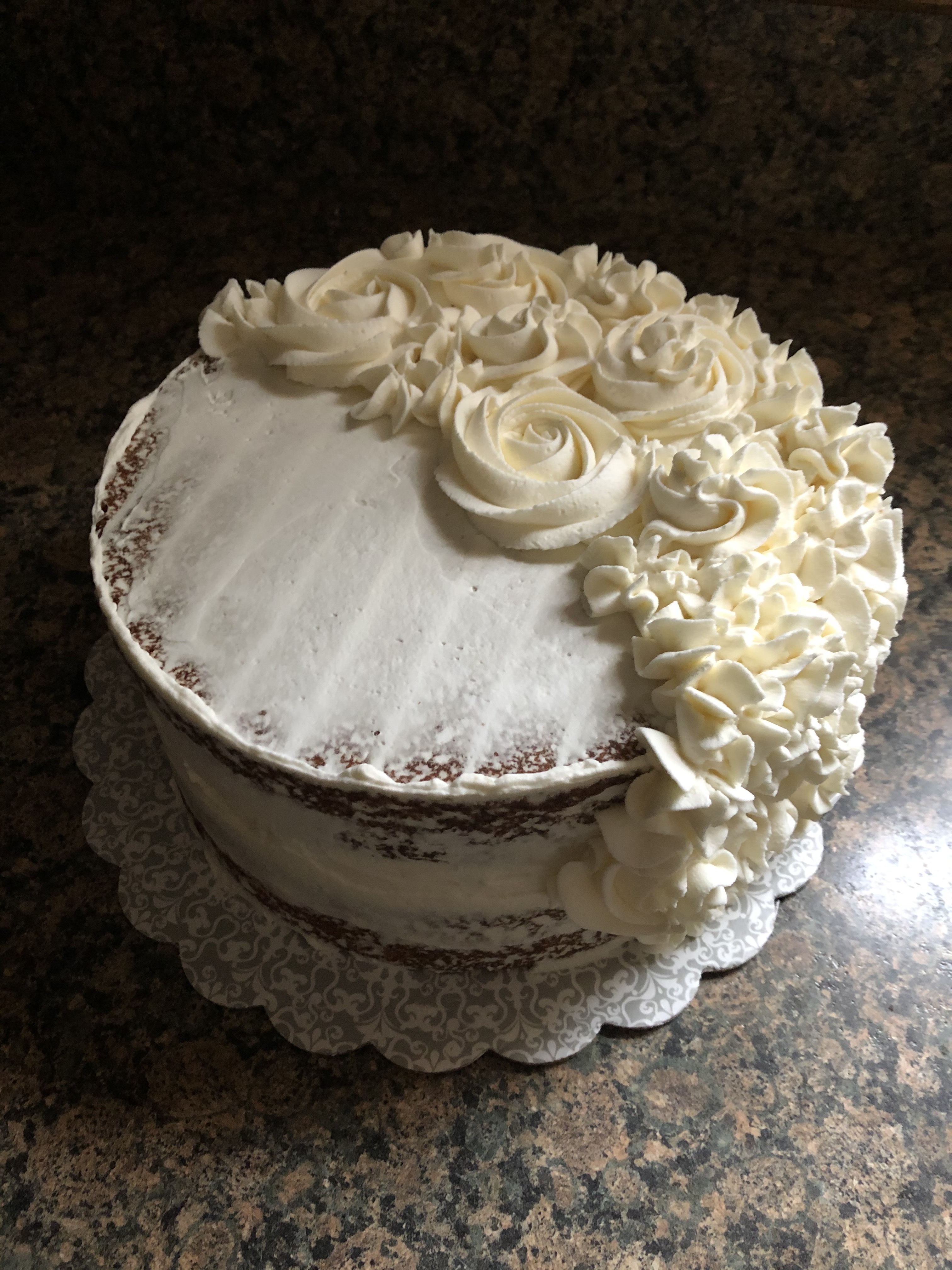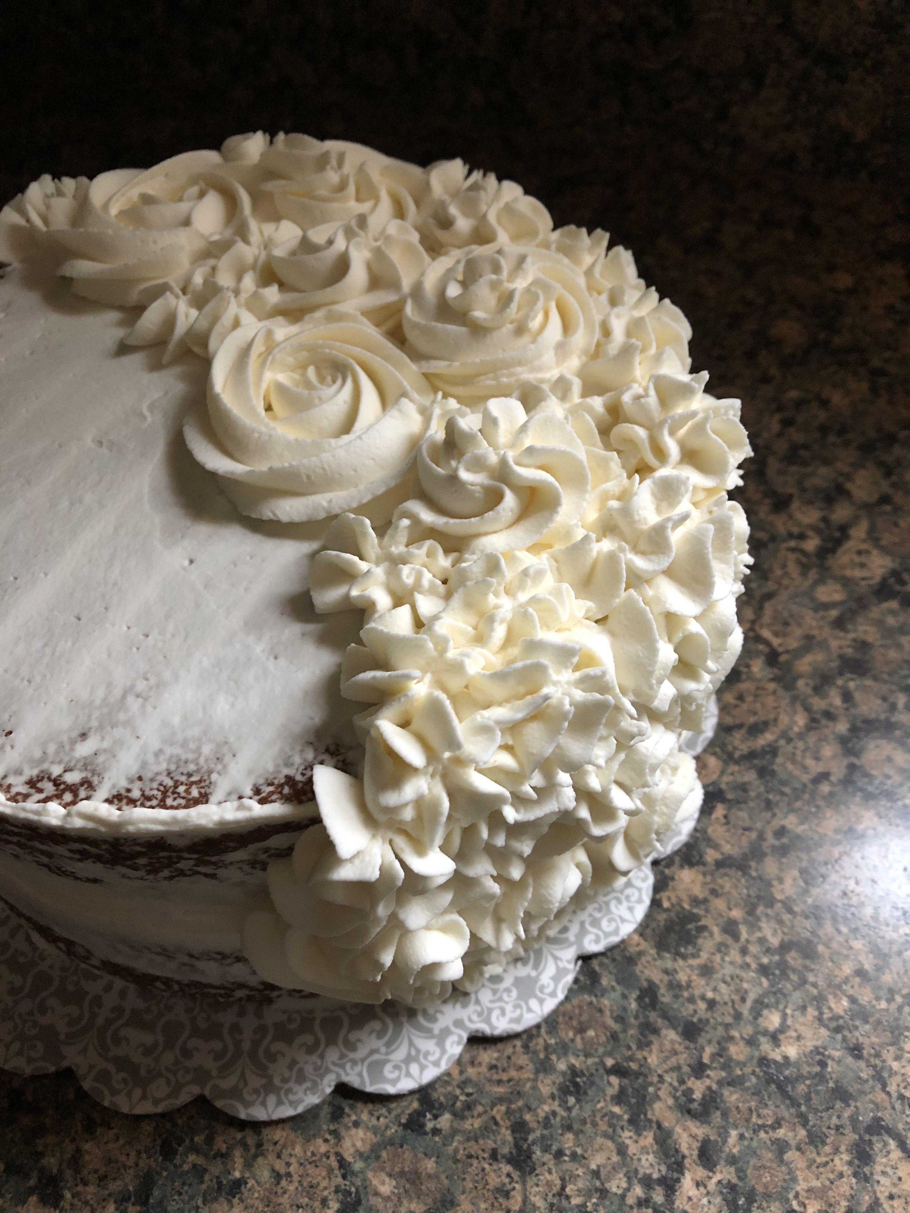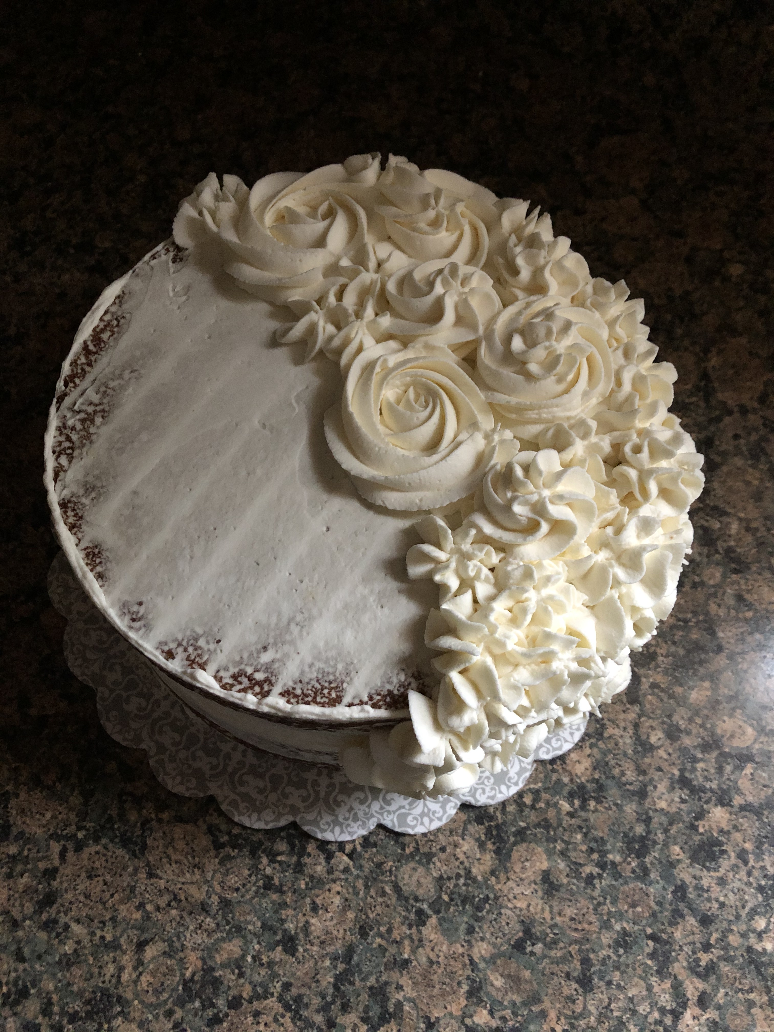 I wasn’t sure if I had enough frosting to fill and cover the cake so I decided to just lightly frost the cake and use the remaining frosting to pipe a few swirls on it.