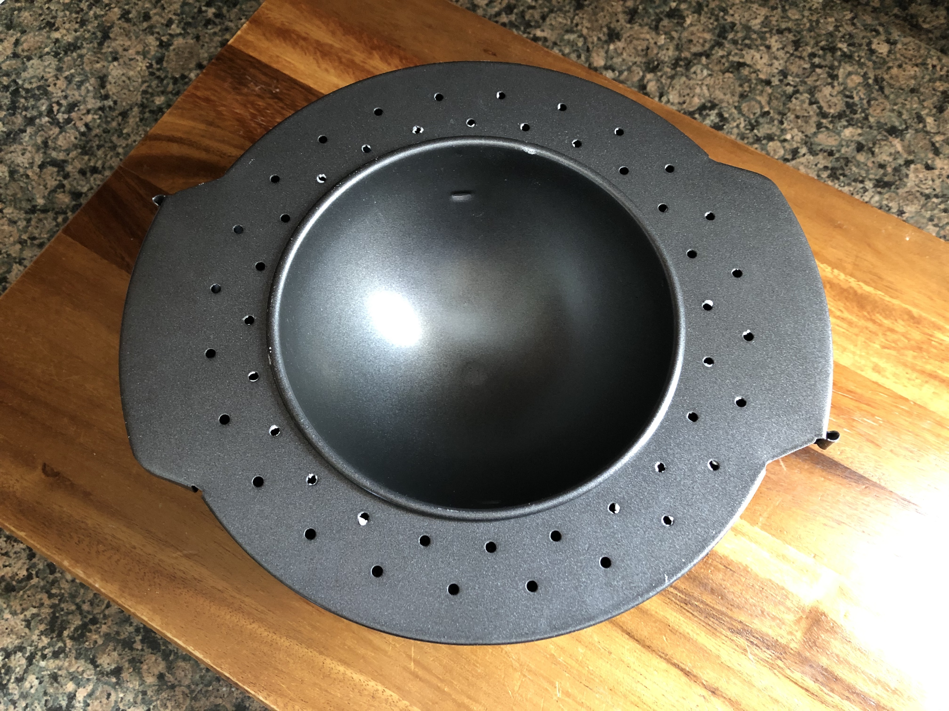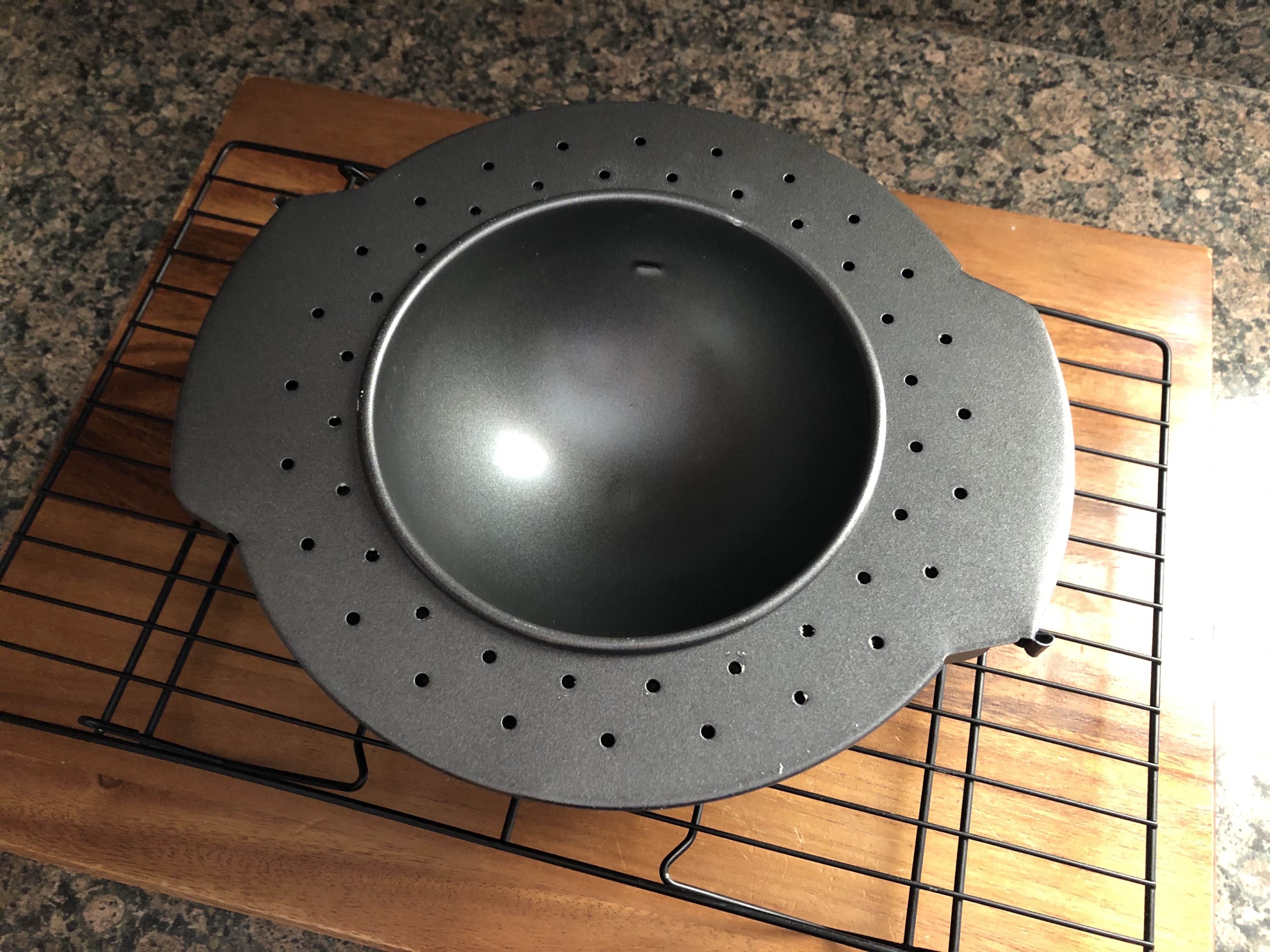 Next, I placed the insert pan over the tall pan and locked it into place and then baked it in a 350 F preheated oven for about 45 minutes. Thankfully the insert pan has small holes in it, which I am assuming is to allow the cake to “breathe” while baking, but, I used them to insert a cake tester to see when the cake was done.